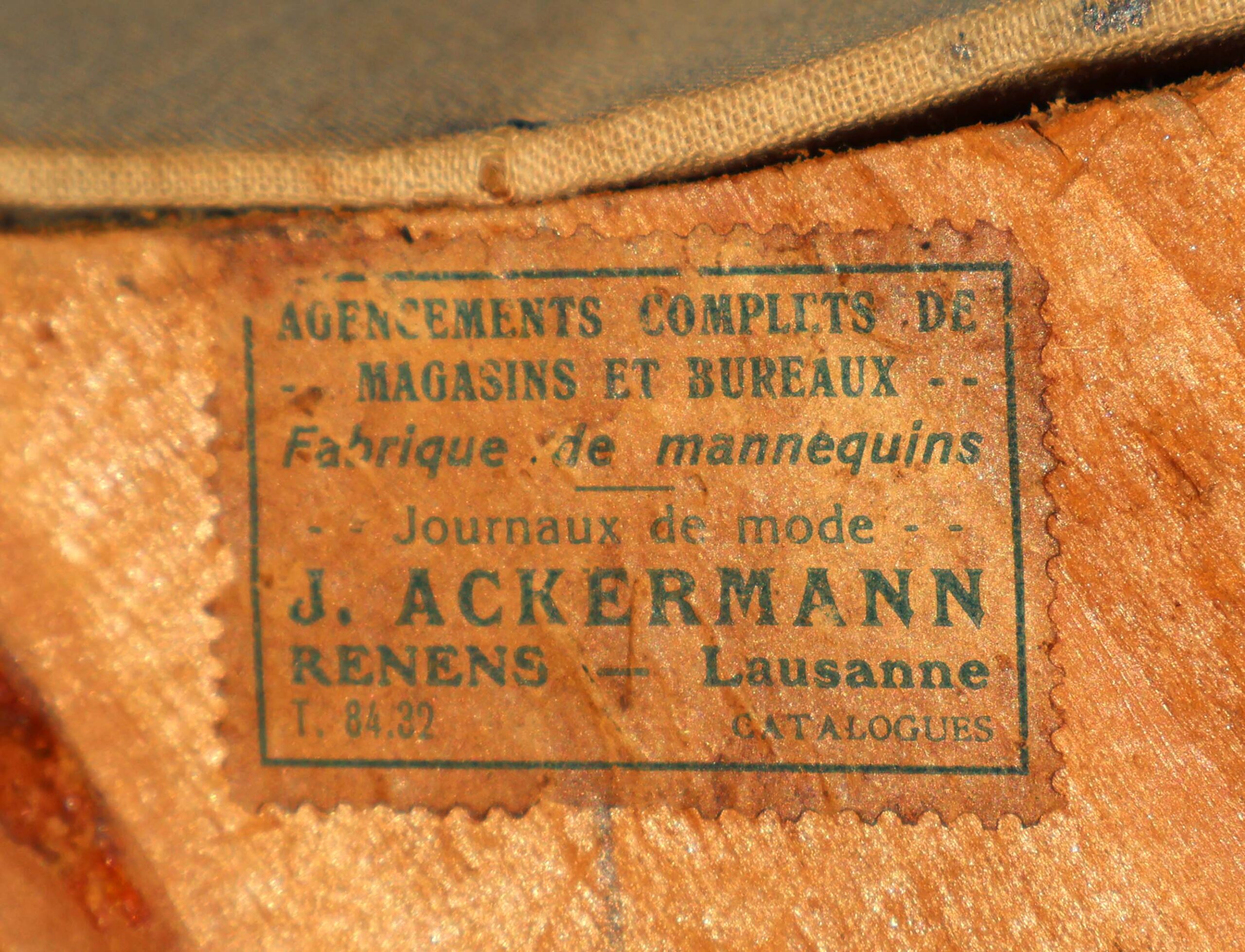 Au dessous, j’ai retrouvé une étiquette du fabricant: J. Ackermann, à Renens. D’après le numéro de téléphone à 4 chiffres, cette pièce doit dater d’avant 1930.