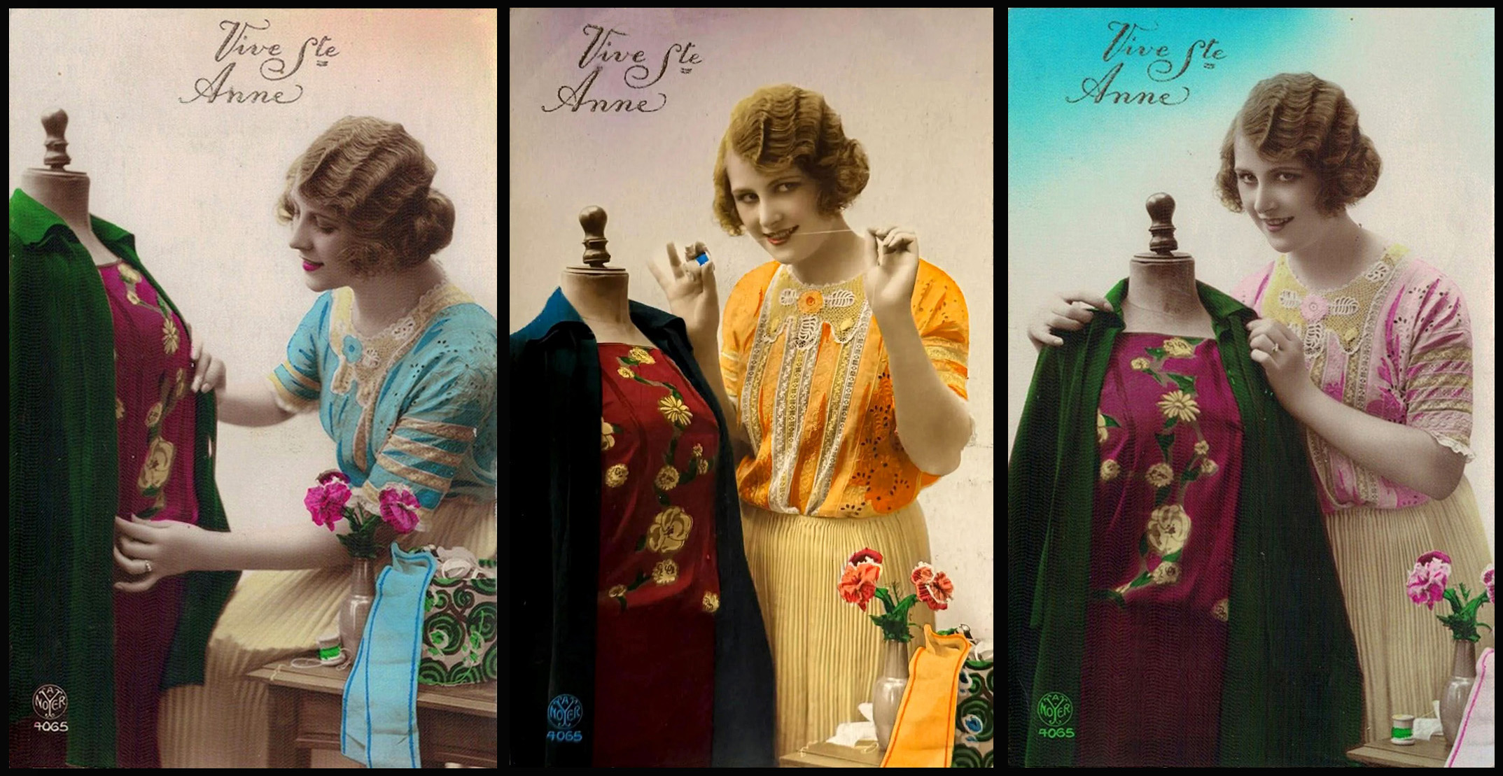 Concernant les cartes postales “romantiques” des années 1930: “Vive Ste Anne”, c’est pour commémorer la sainte patronne des couturières …