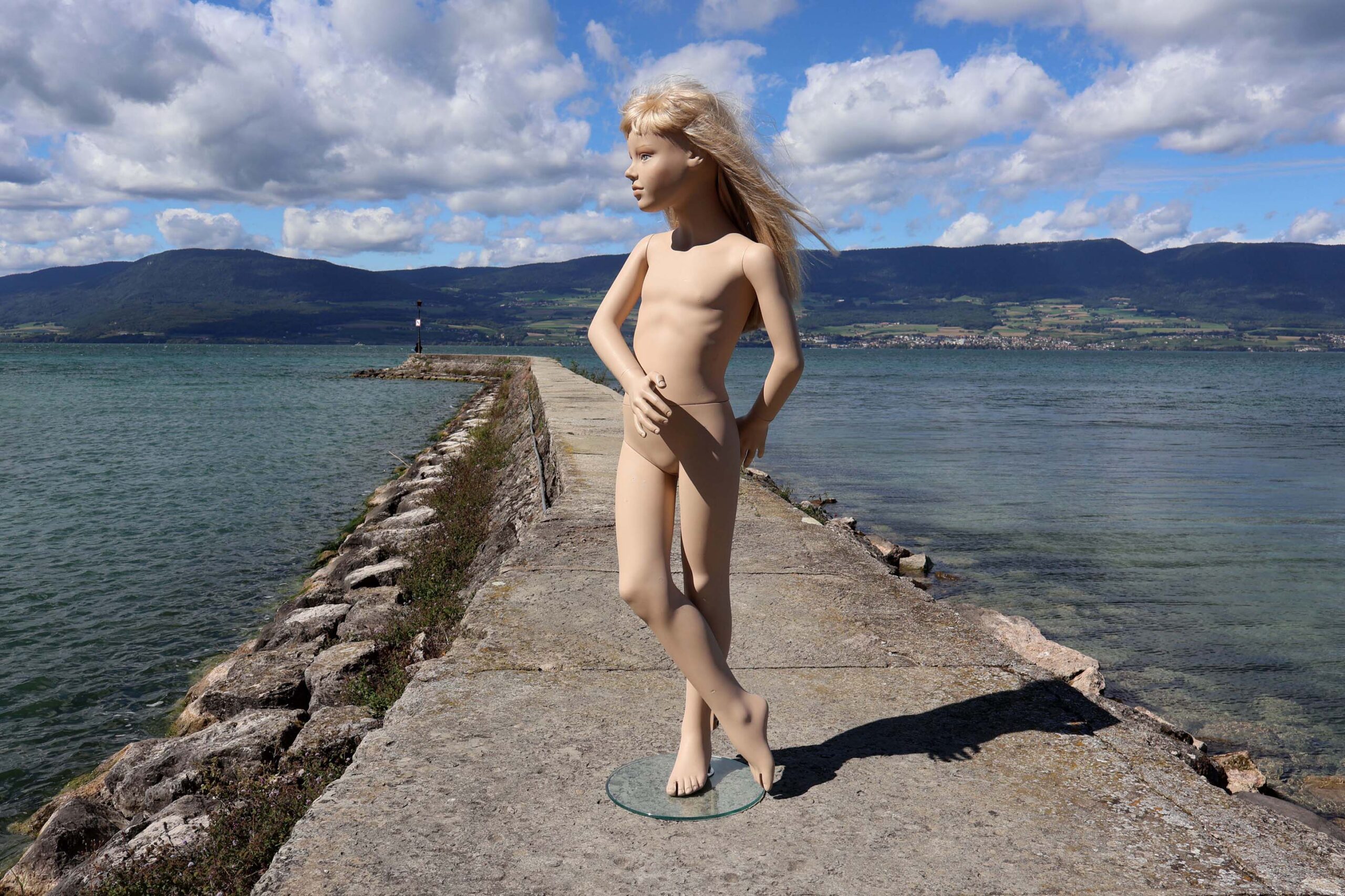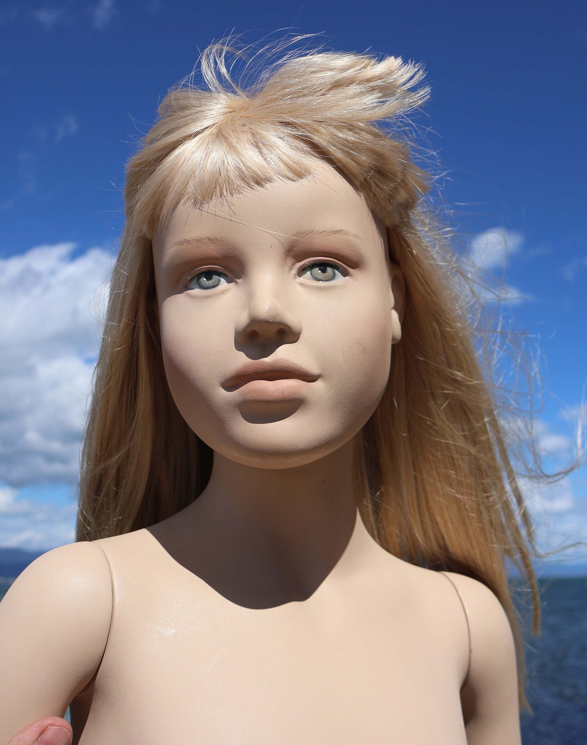 Belle perruque blonde avec des cheveux longs. Elle est collée, mais je pense que peut l’on essayer de la décoller. Toutefois, elle est bien en harmonie avec la tête de ce mannequin. J’ai dû refaire une retouche de vernis sur le nez, et une autre petite sur la joue. Et quelques petites ailleurs sur le corps, mais ça se voit moins.