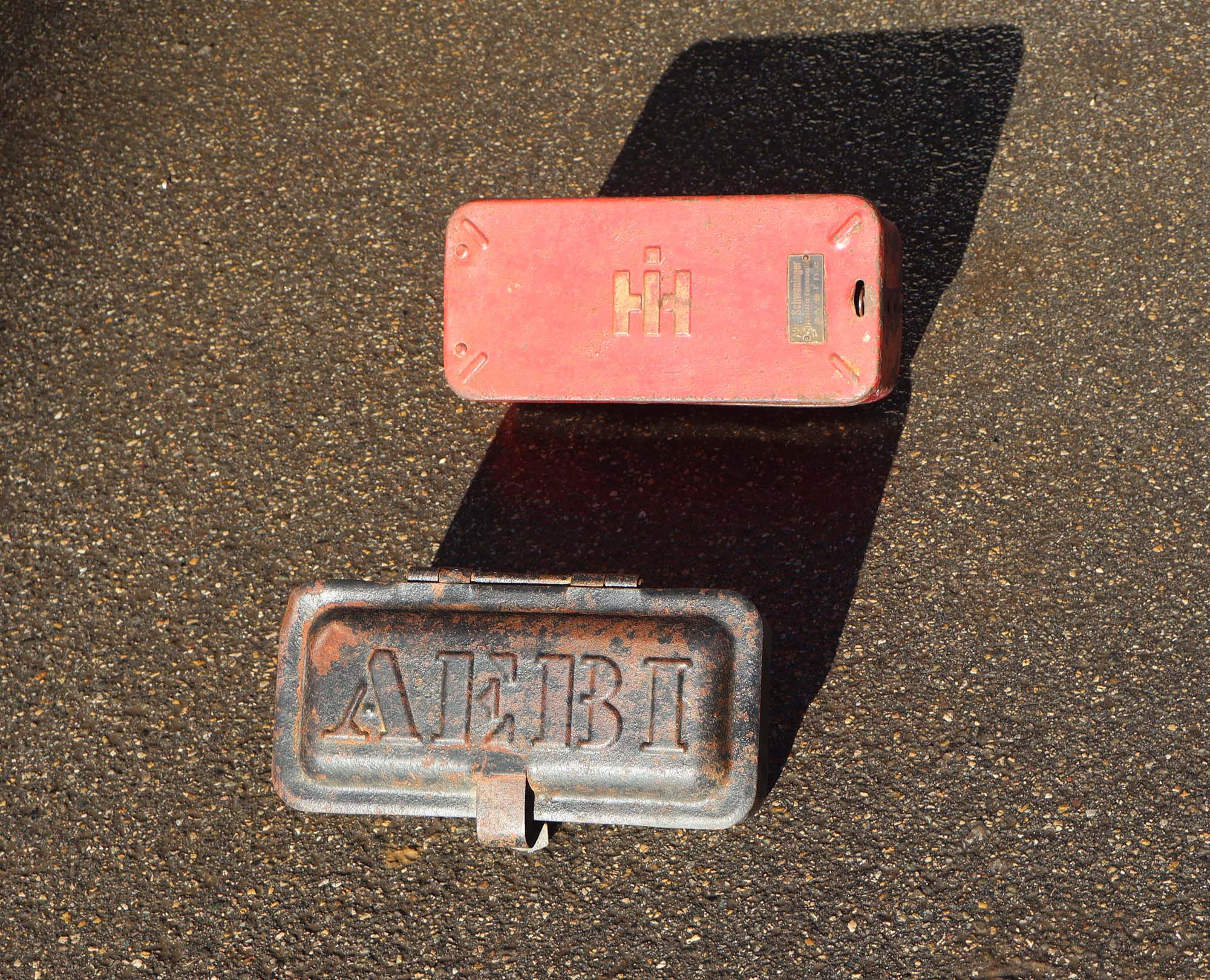 Boites à outils tracteurs: Ce sont des boites en fer avec couvercle. Qui étaient fixées sur les machines agricoles, et tracteurs des années 1950. Afin d’avoir certains outils pour dépanner, ou changer certains équipement, lors du travail des champs.