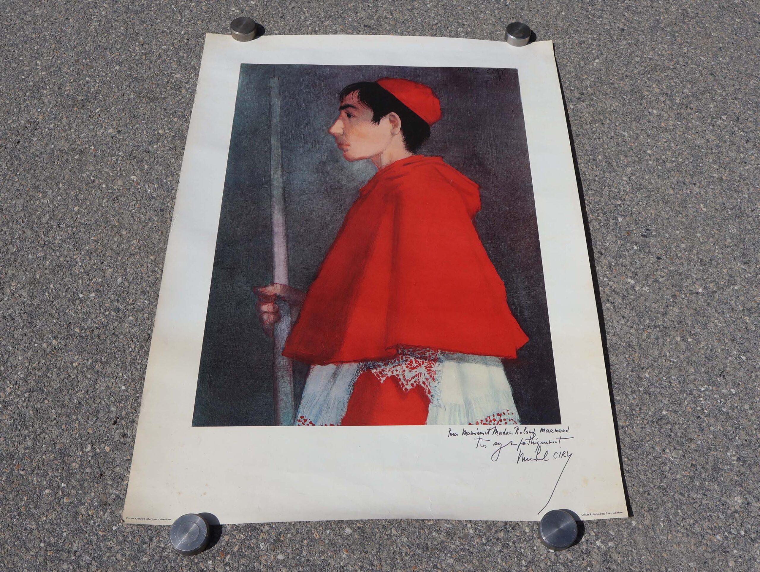 Michel Ciry poster dédicacé. C’est un “print” / poster d’un tableau du peintre français Michel Ciry. L’œuvre est datée de 1967, et représente un jeune cardinal, en habit rouge et blanc, à calotte rouge.