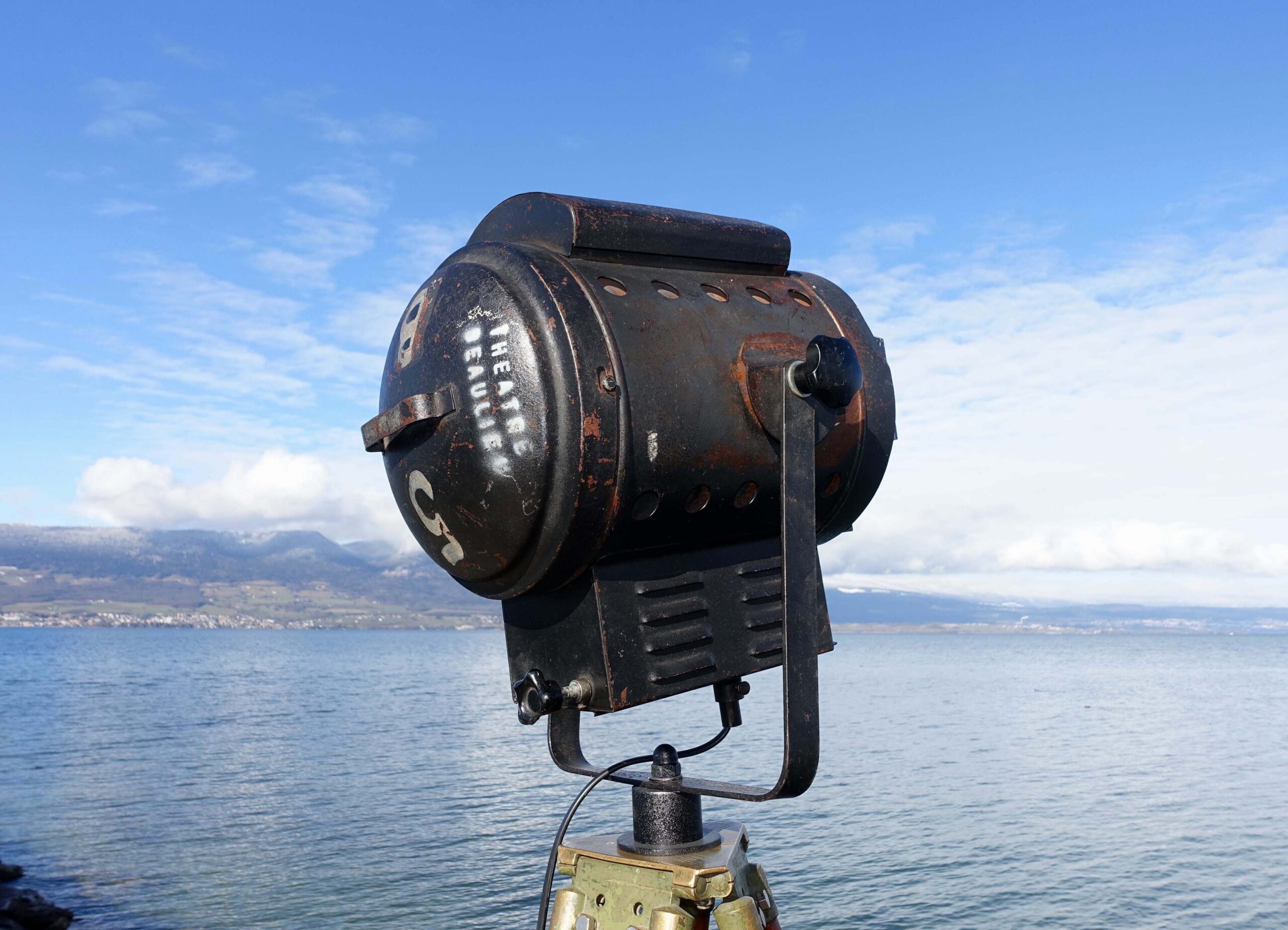 Pour le projecteur, j’ignore la marque, car il n’a pas de label. D’après la forme, des années 1950. Ce qui fait son intérêt, c’est qu’il provient du théâtre de Beaulieu à Lausanne, (marquage à l’arrière).