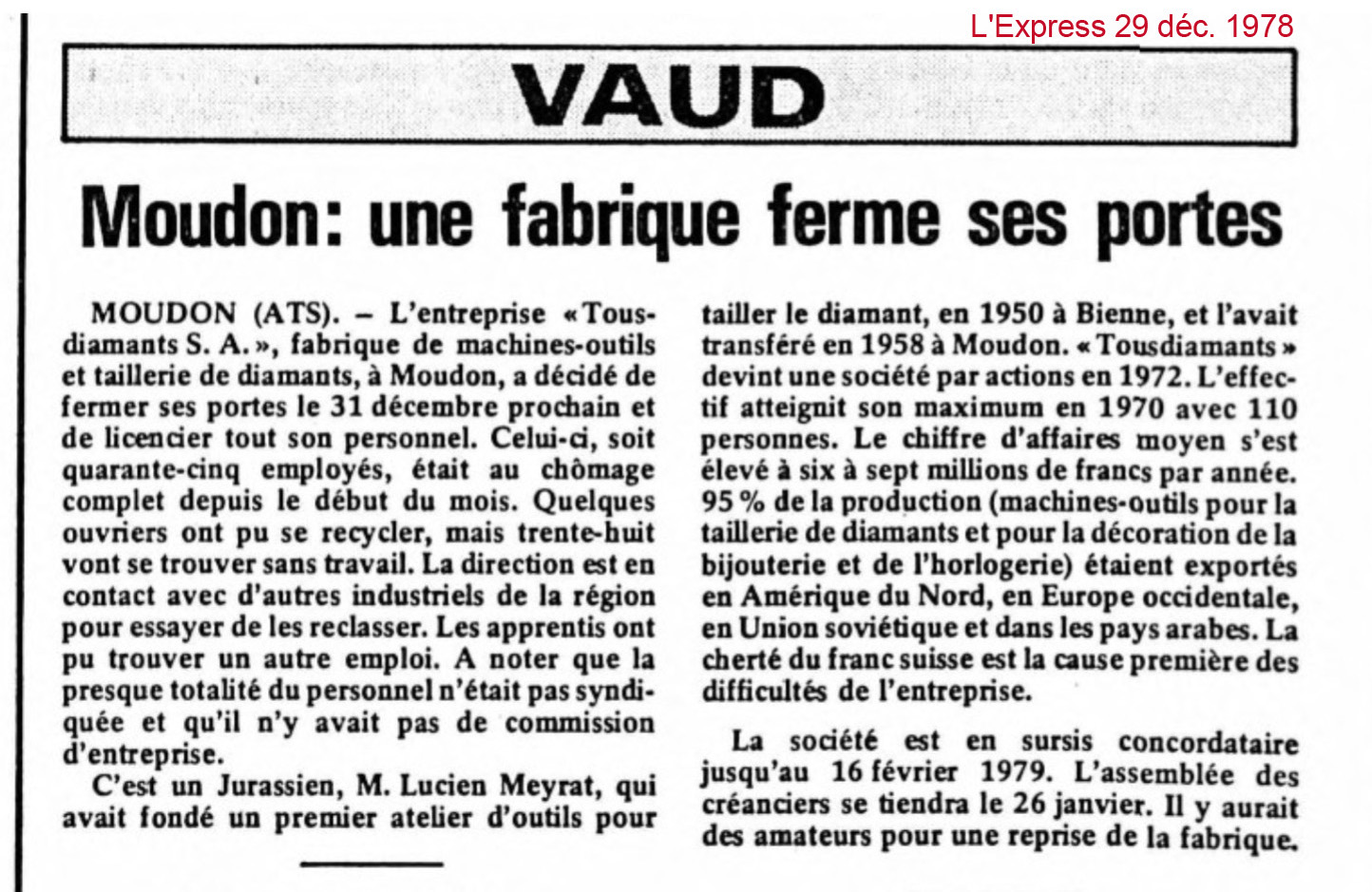 Cette entreprise créée en 1950 à Bienne, par Lucien Meyrat, fût transférée en 1958 à Moudon. Cette société était spécialisée dans la fabrique de machines-outils, pour tailler les diamants. Elle fermera en 1979.