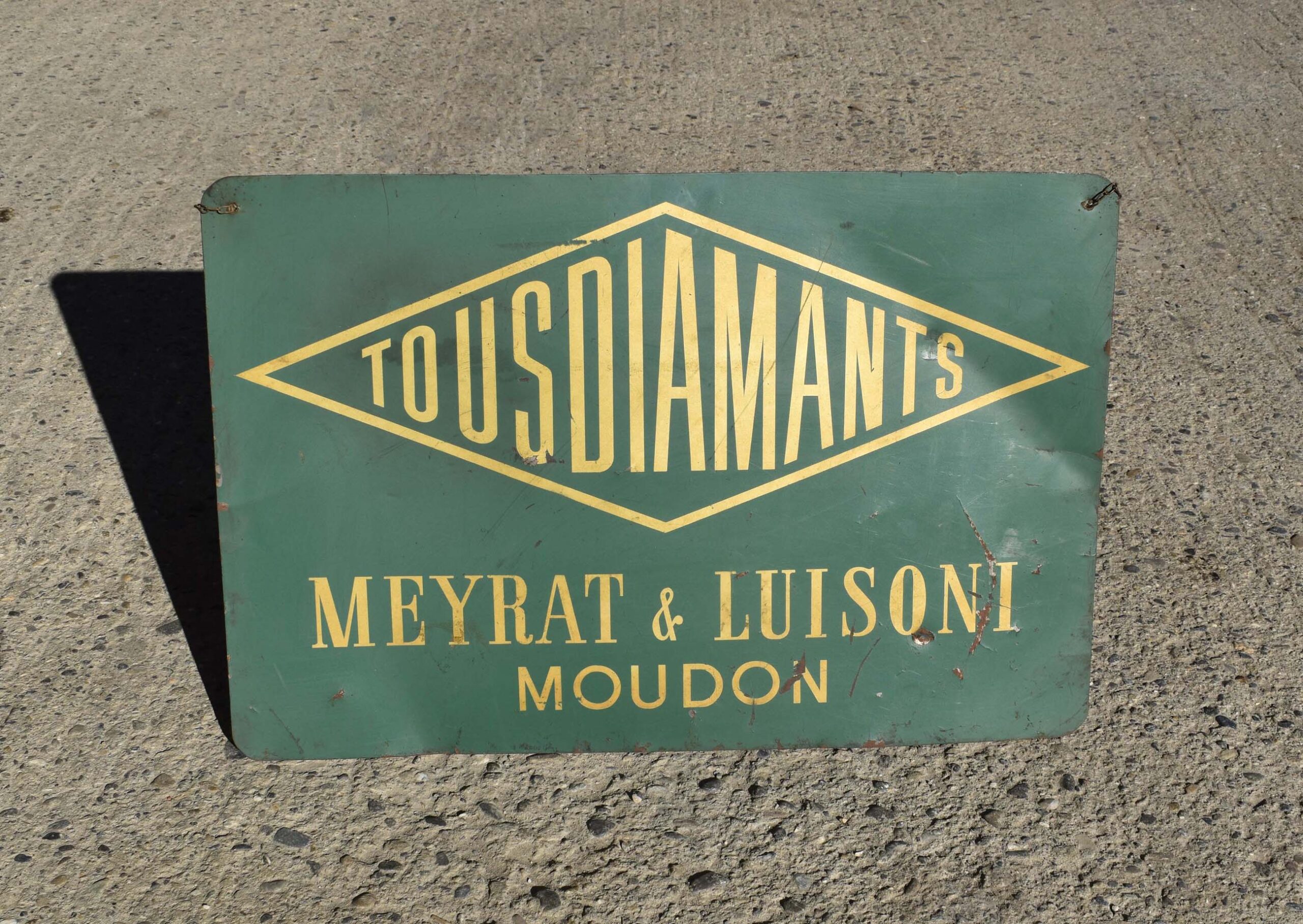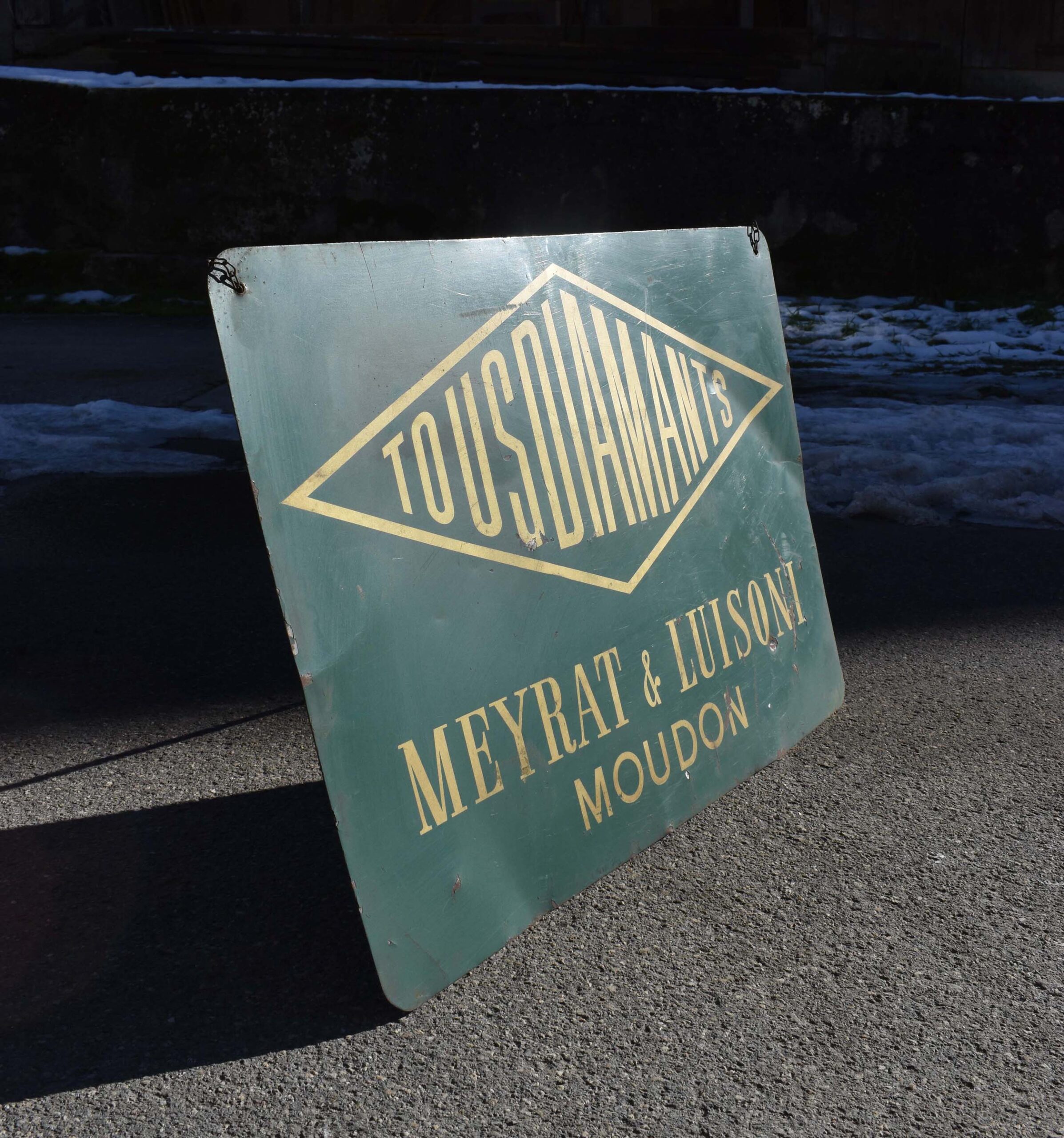 Tousdiamants Meyrat Luisoni. Curieuse petite enseigne en fer, à suspendre avec une chainette. Pour faire la publicité de la fabrique Meyrat & Luioni à Moudon.