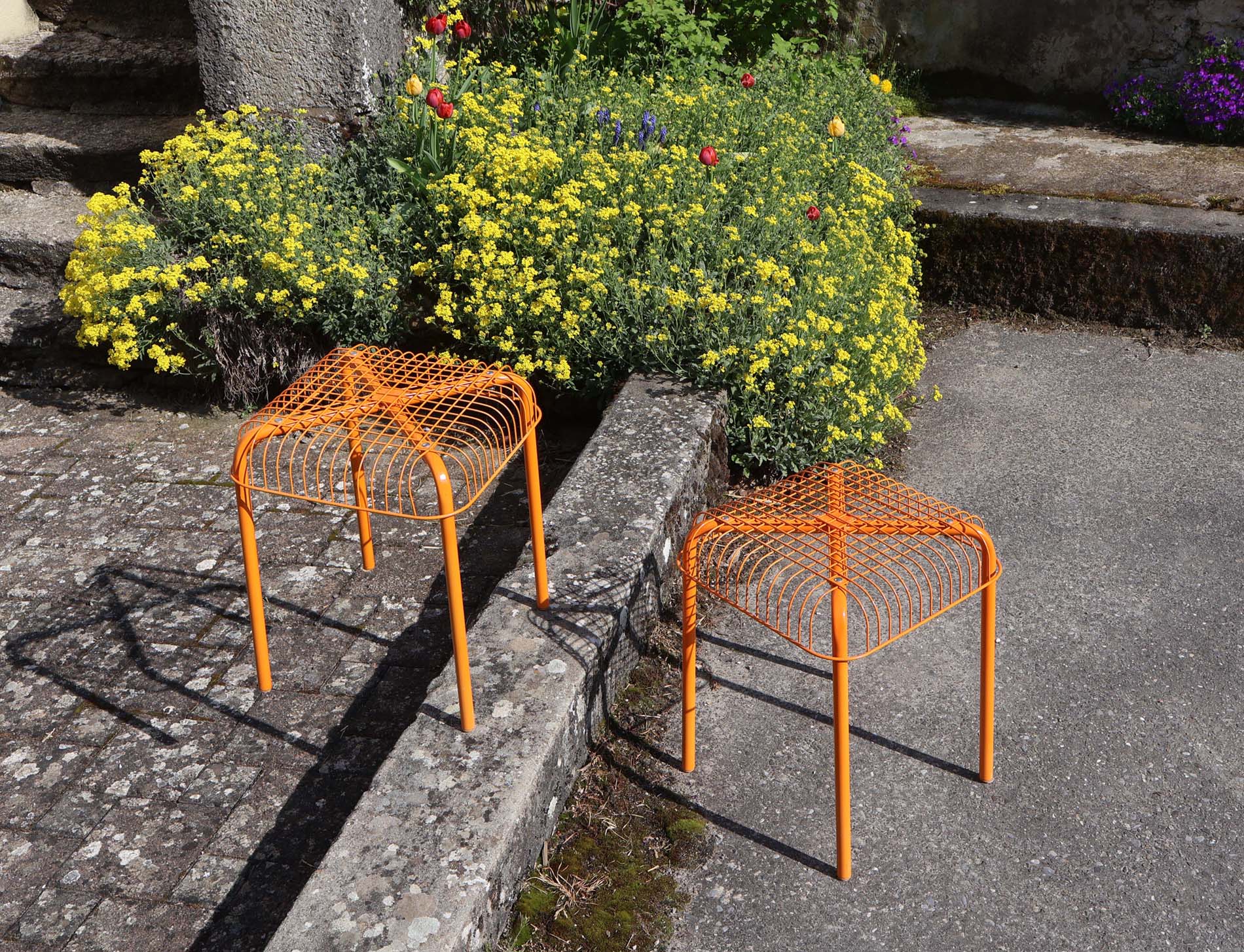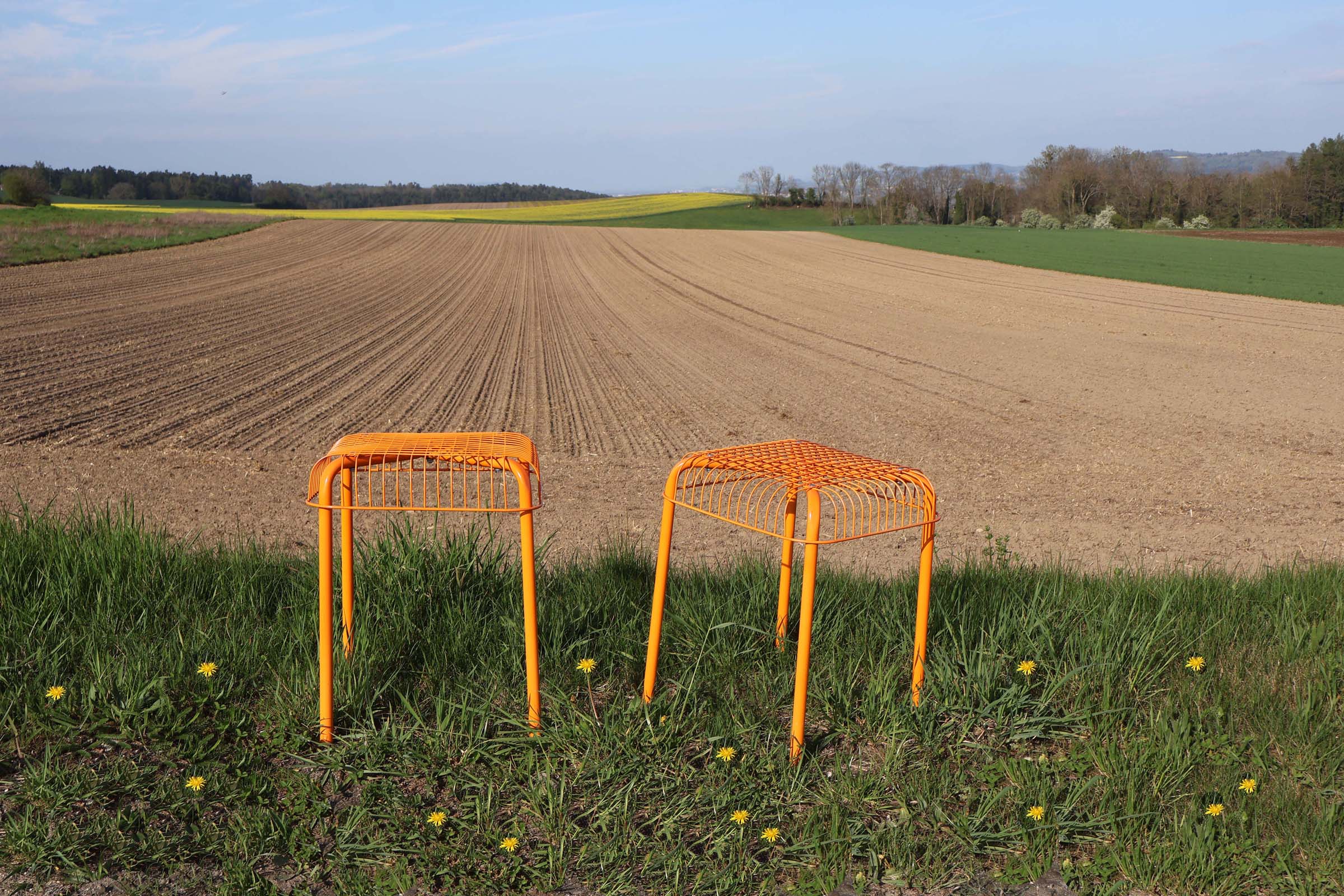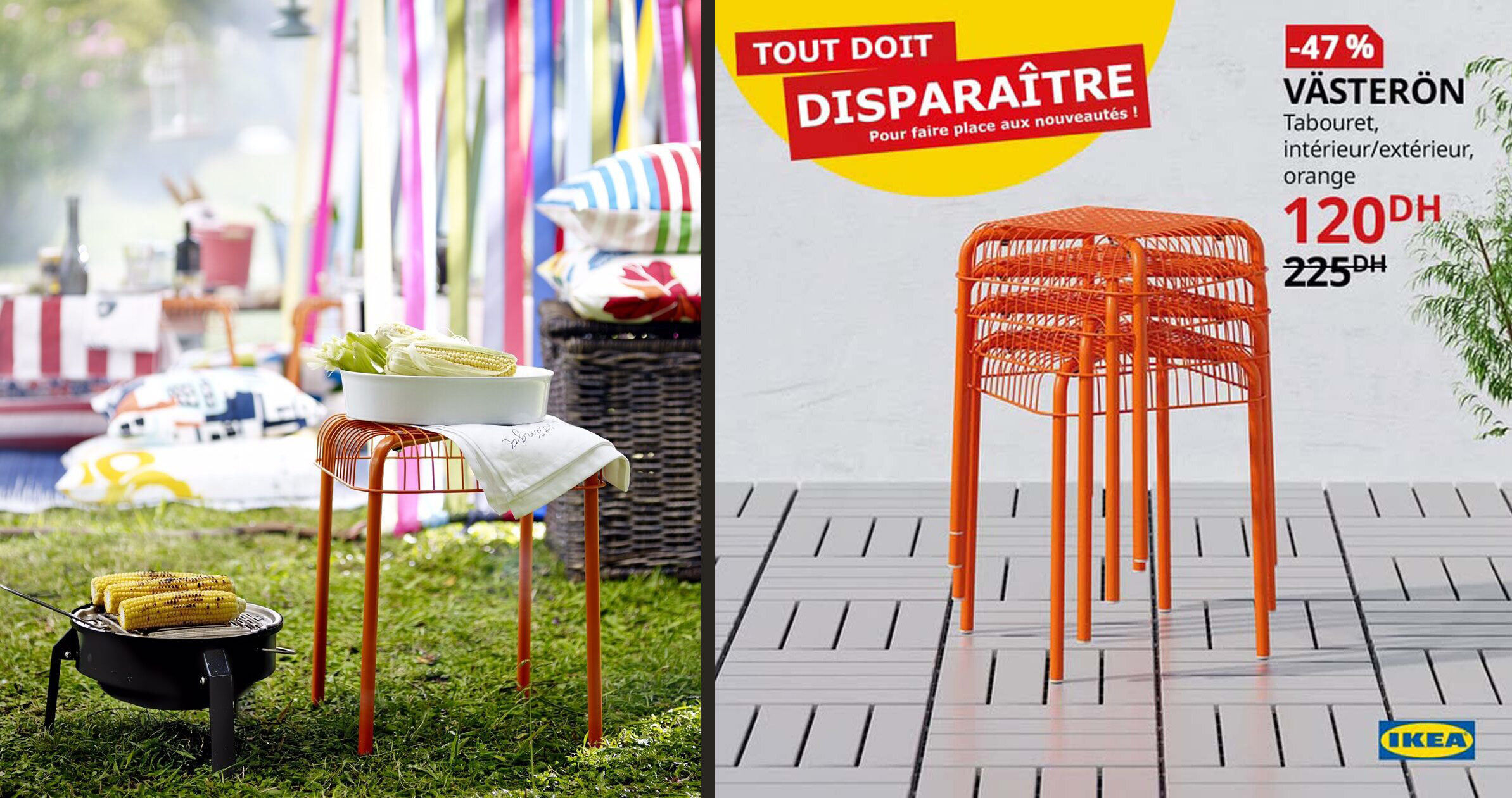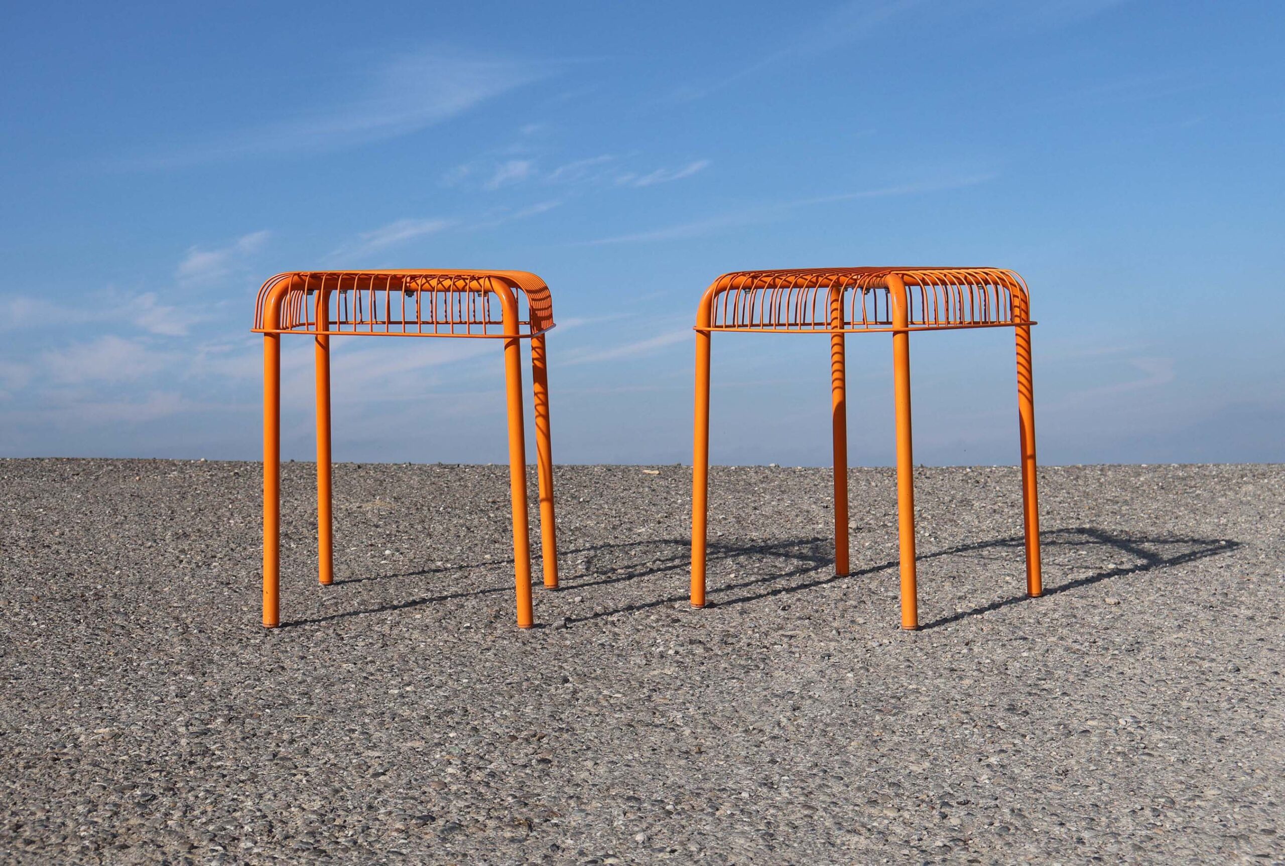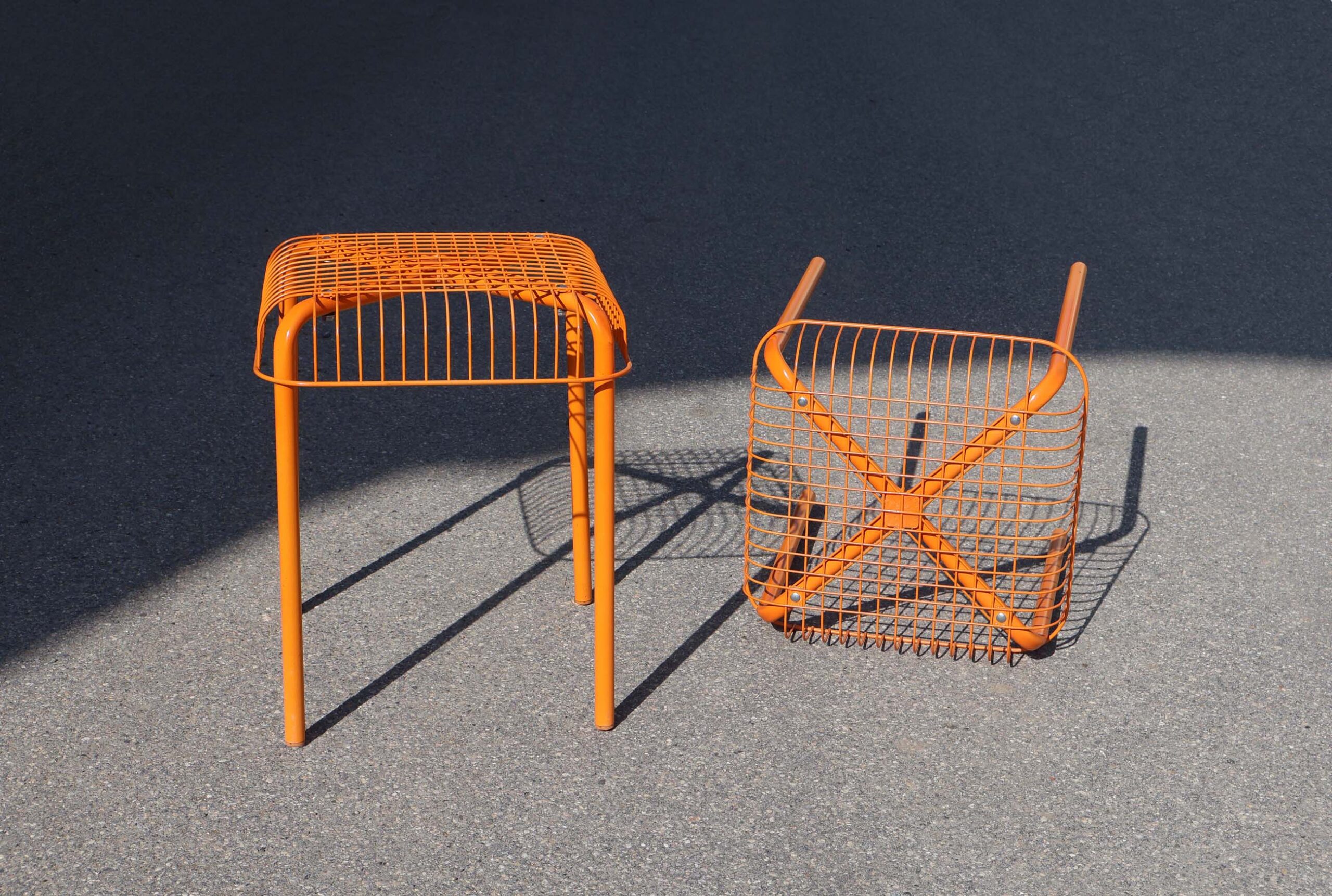 Västerön orange stools IKEA: C’est une paire de tabourets empilables, au style minimaliste, (pour ne pas dire misérabiliste). Création vers 2015. Design de Inma Bermúdez et Francis Cayouette.