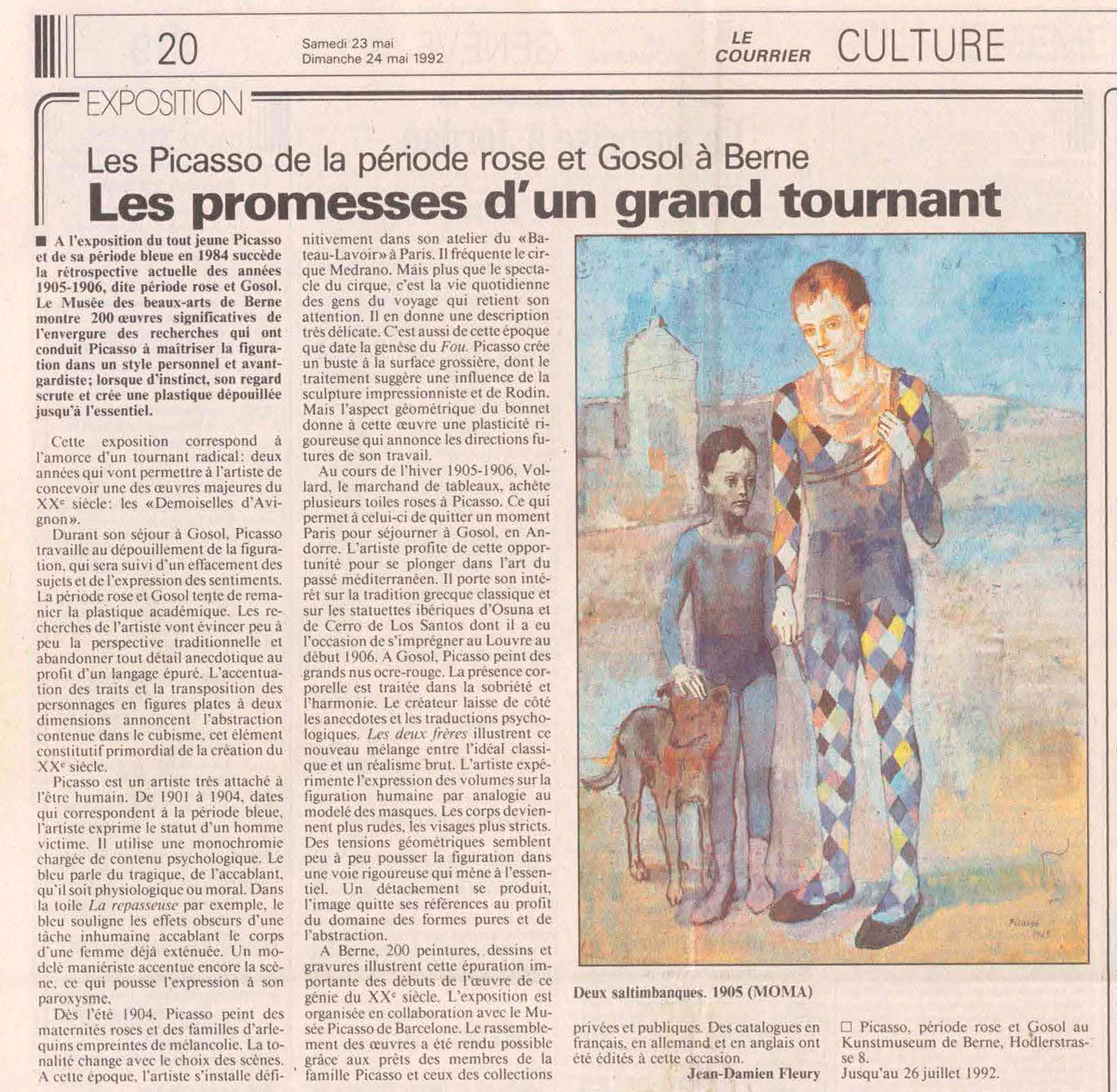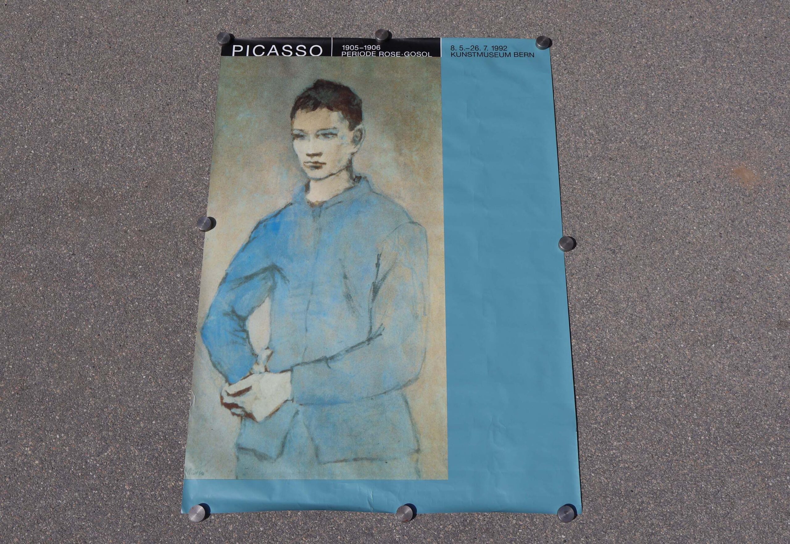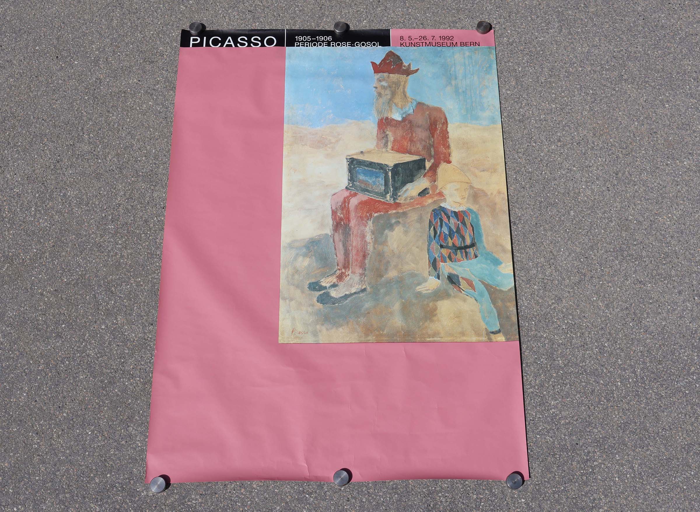 Cette expo s’est tenue entre mai et juillet 92 au musée d’art de Berne. Une affiche avec fond bleu, représentant “le garçon bleu”. Et l’autre avec une reproduction du tableau du joueur de vielle et jeune arlequin, sur fond rose.