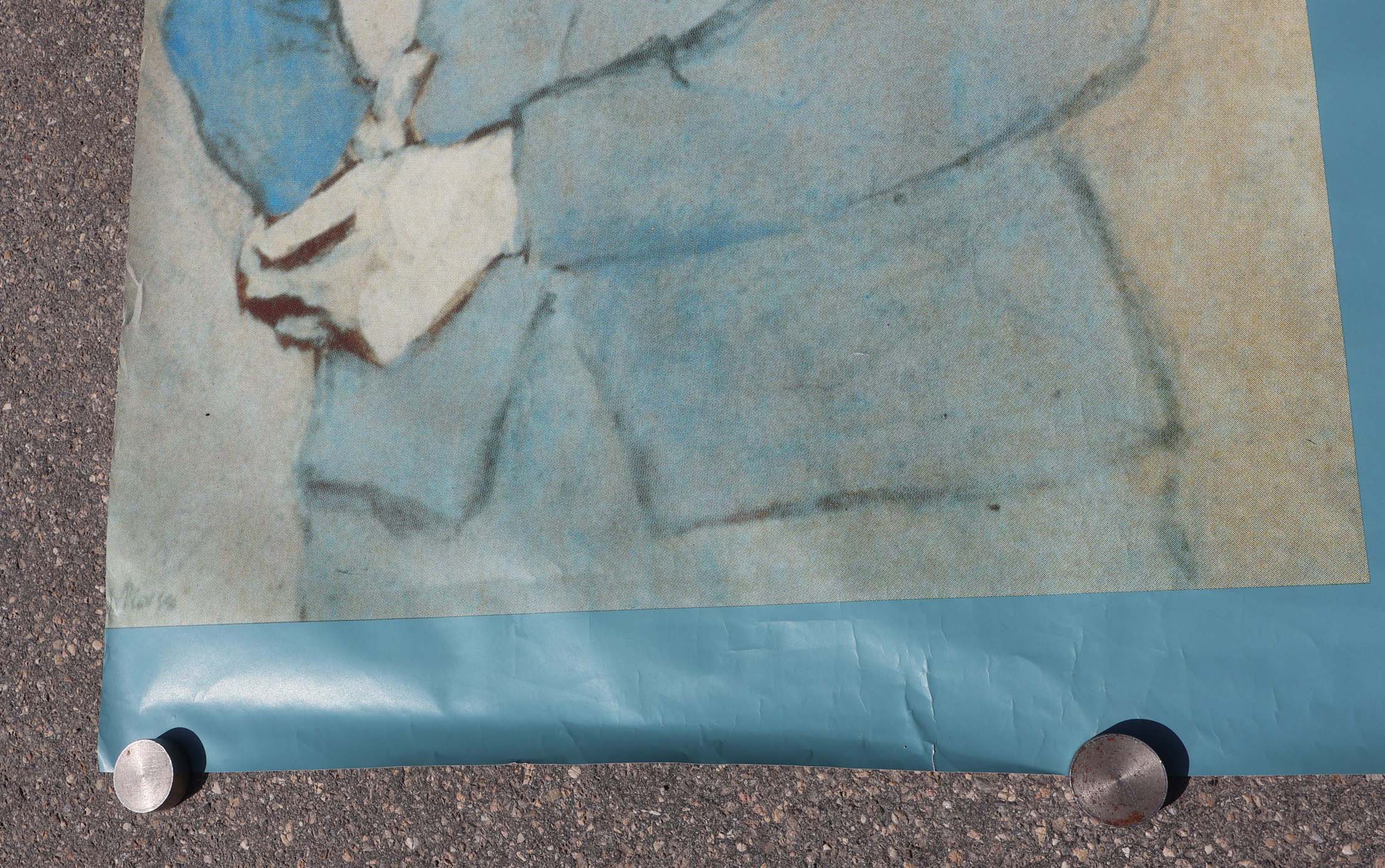 Format 90×127,5cm. Pas d’indication du graphiste, ni de l’imprimeur. Froissées en haut et en bas. Et la bleue à une petite déchirure en bas au milieu.