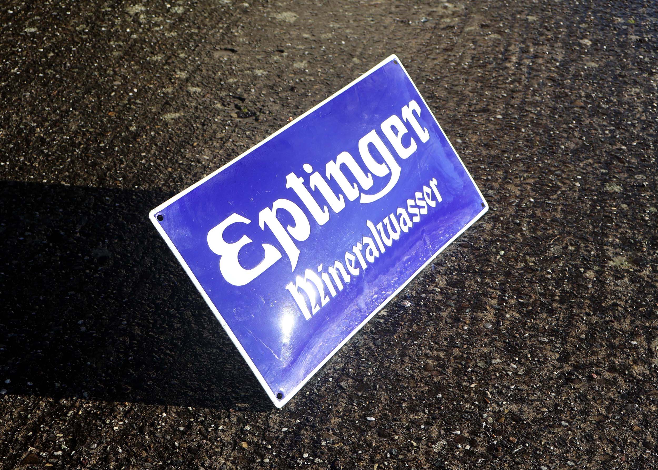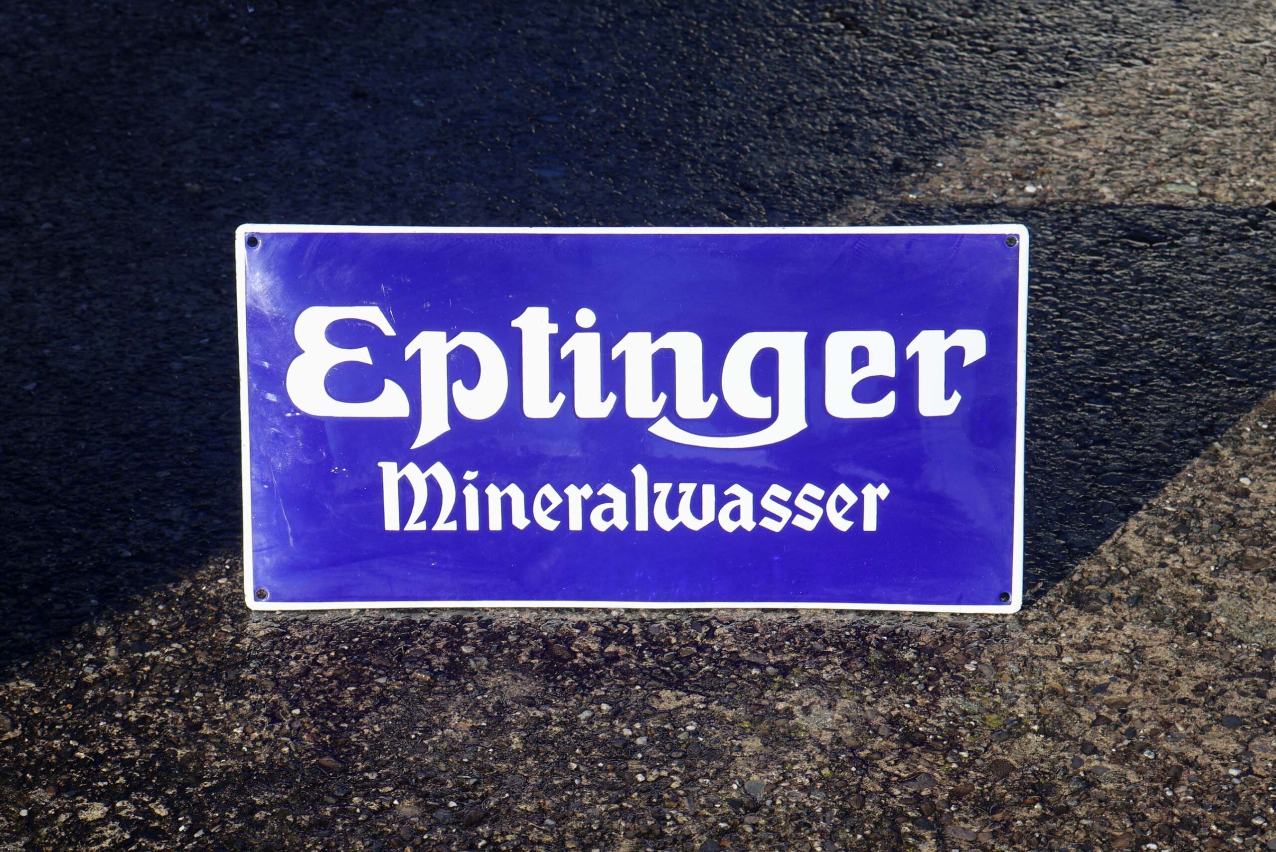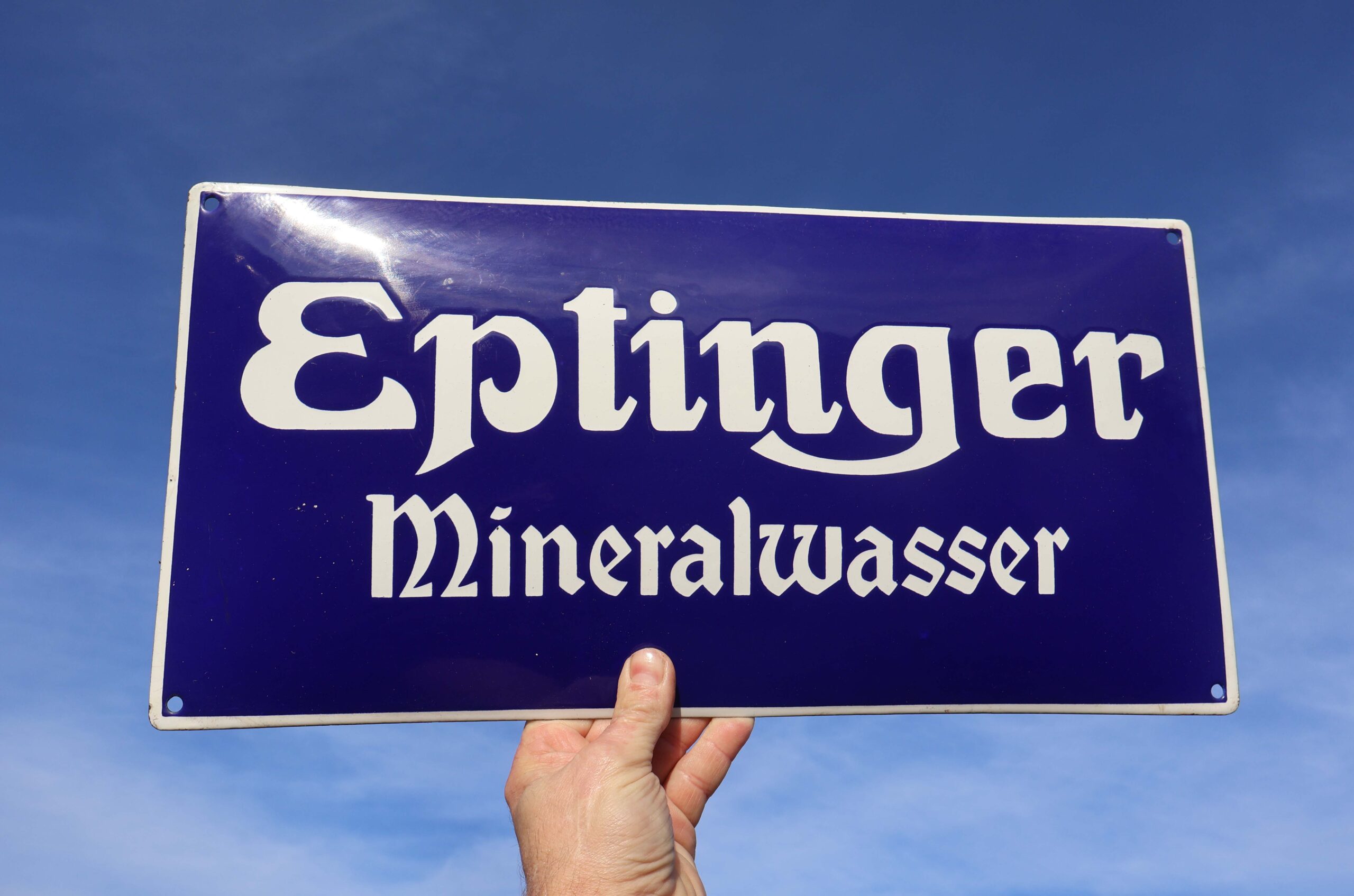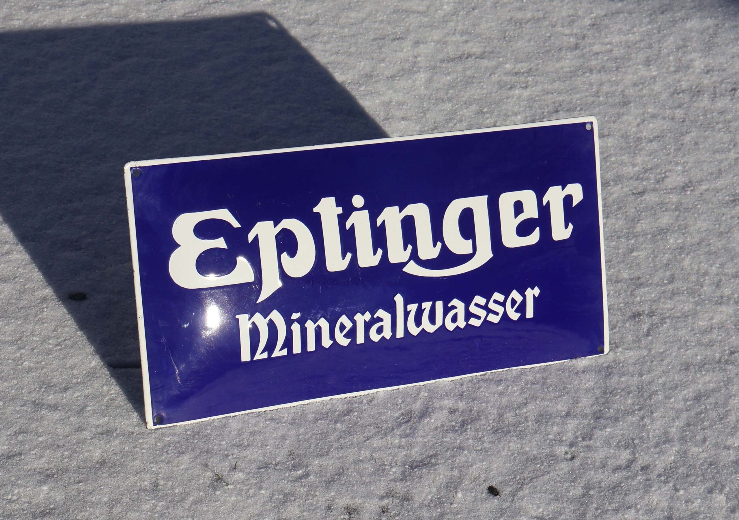 Eptinger Emailschild 1930er. C’est une plaque émaillée bombée des années 1930. Pour la maque d’eau minérale Suisse “Eptinger”, située à Eptingen, dans le canton de Bâle.