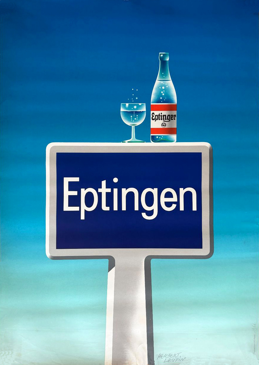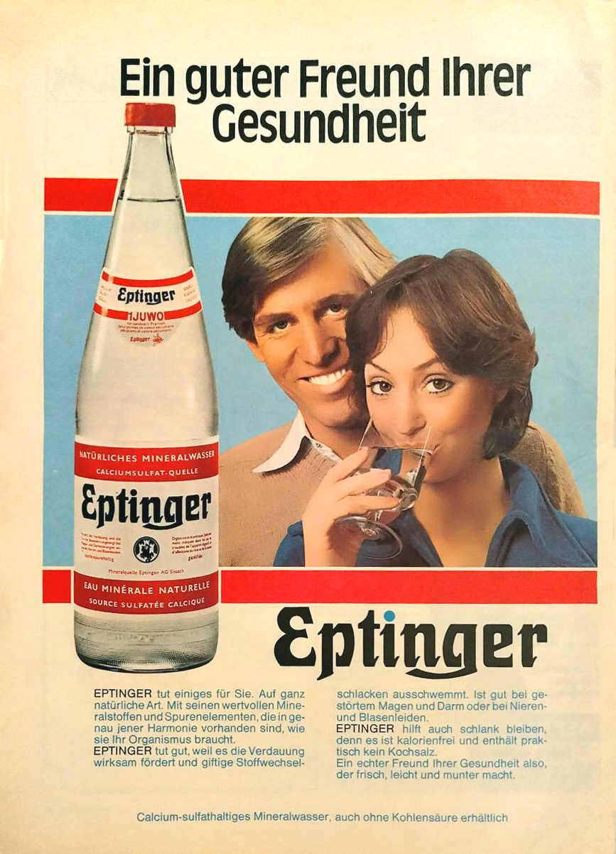 Avec sous le logo Eptinger, (dont le lettrage n’a changé qu’en 2018). La mention en allemand “Mineralwasser”, (traduction eau minérale). Avec une typographie gothique. Couleurs bleu et blanc.