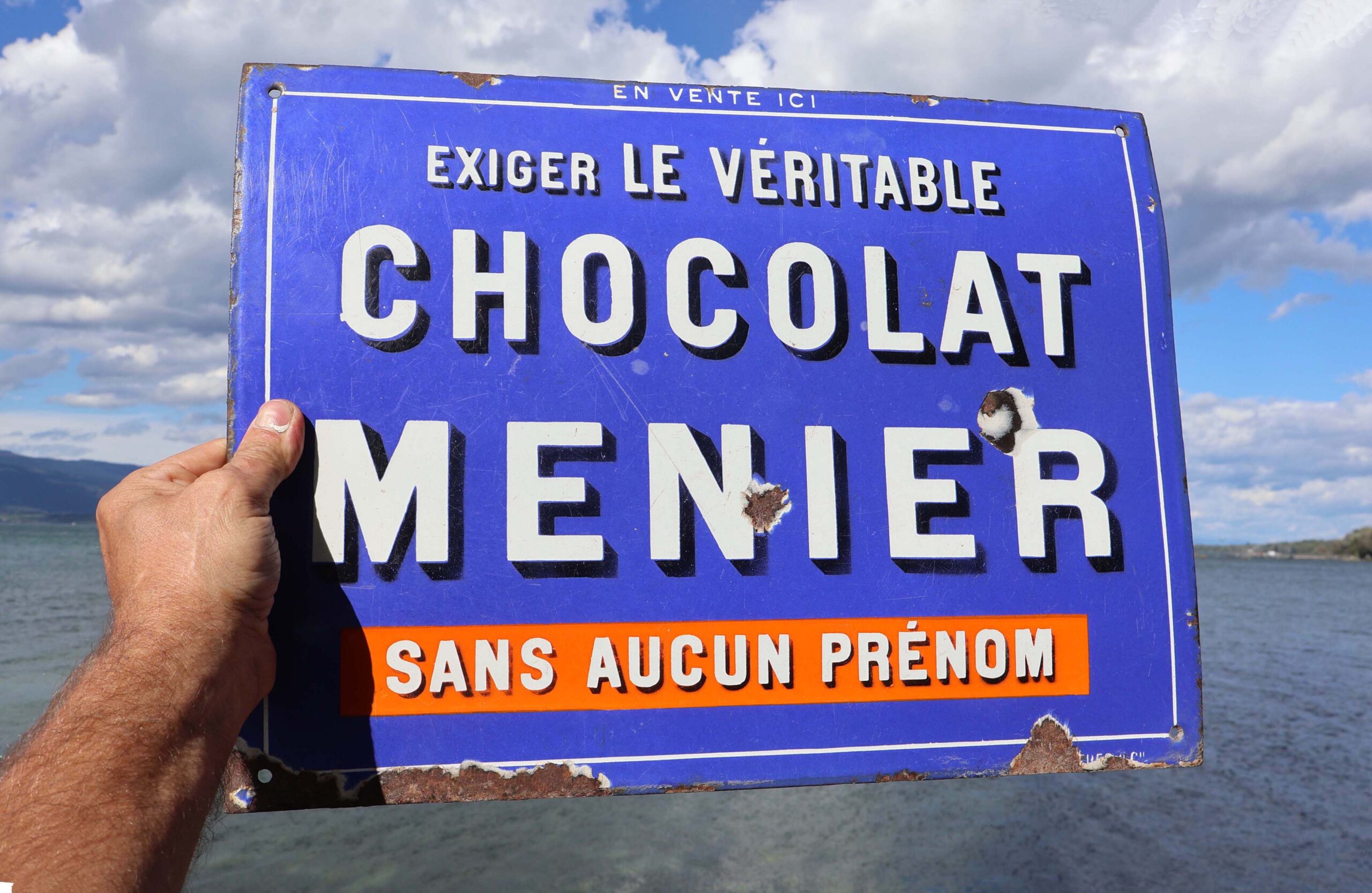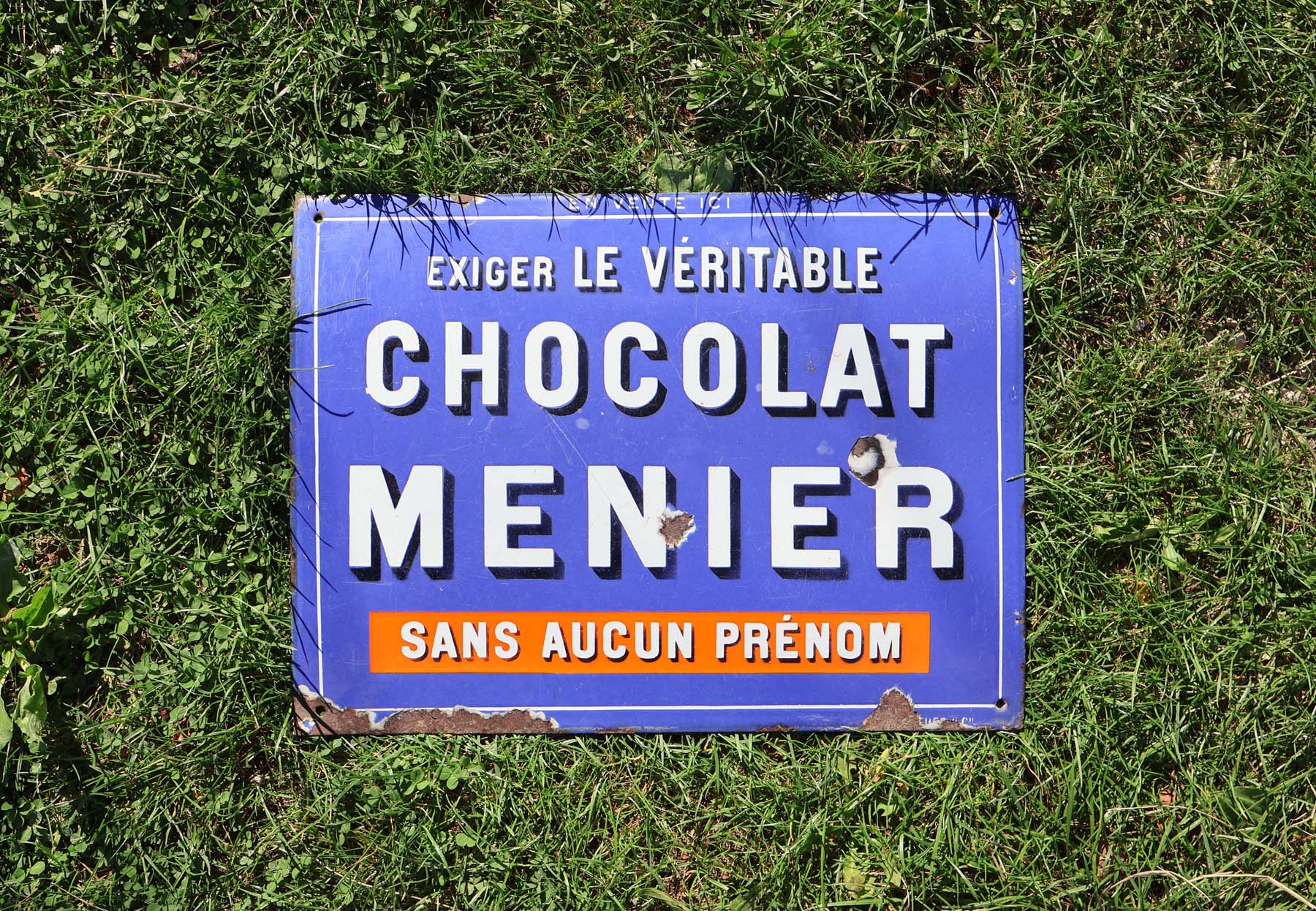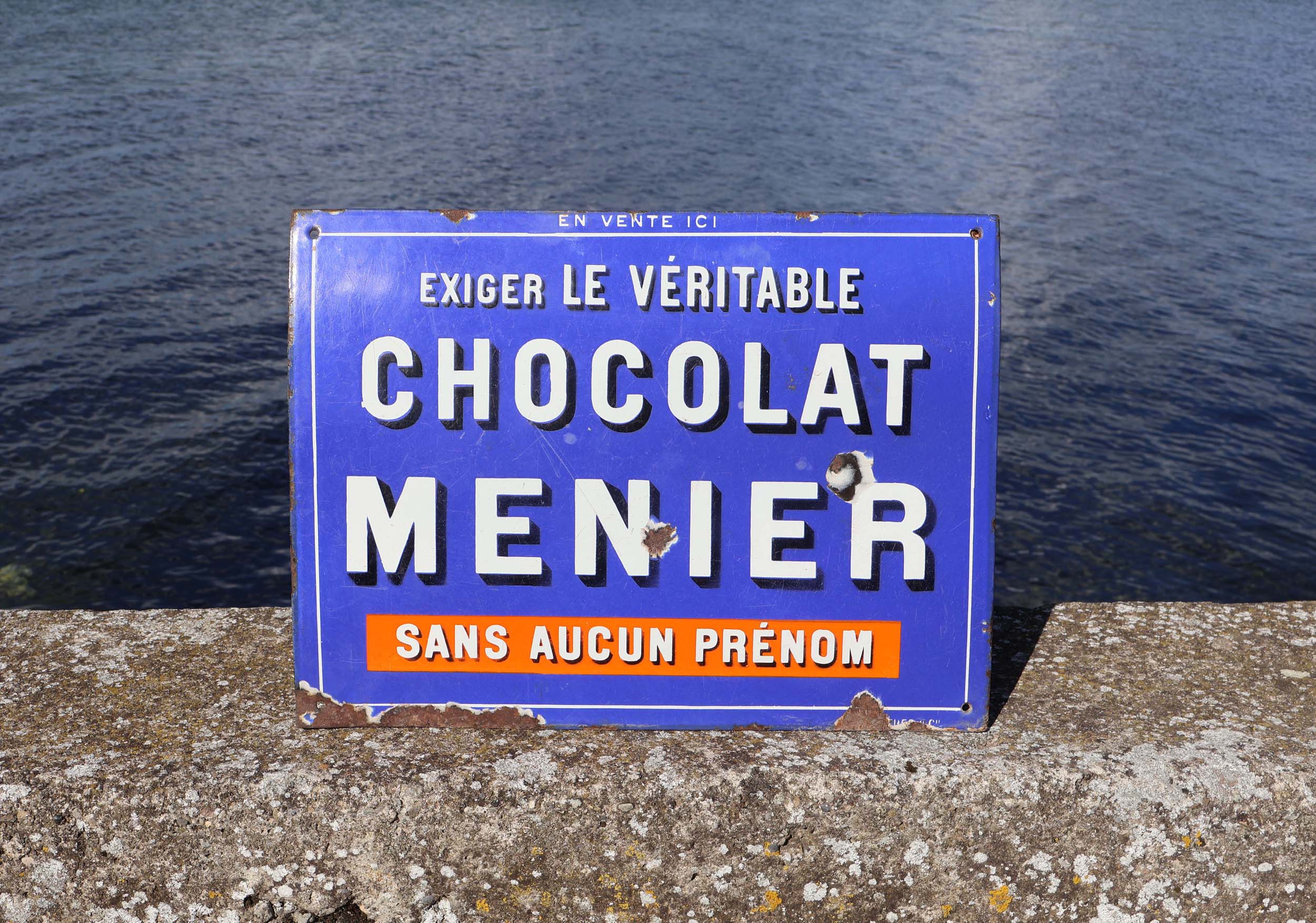 Tôle acier plate, format 43x32cm, avec émaillage bleu, (plutôt clair). Lettrage blanc, avec ombrage noir. Avec marquages : En vente ici, exigez le véritable chocolat Menier. Avec au bas dans un bandeau orange le slogan : Sans aucun prénom.