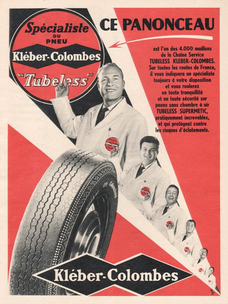 Avec le texte : “Spécialiste du pneu Kléber Colombes Tubeless”. Ronde, avec support mural. Reprenant le logo de la marque, avec les couleurs orange et bleu.