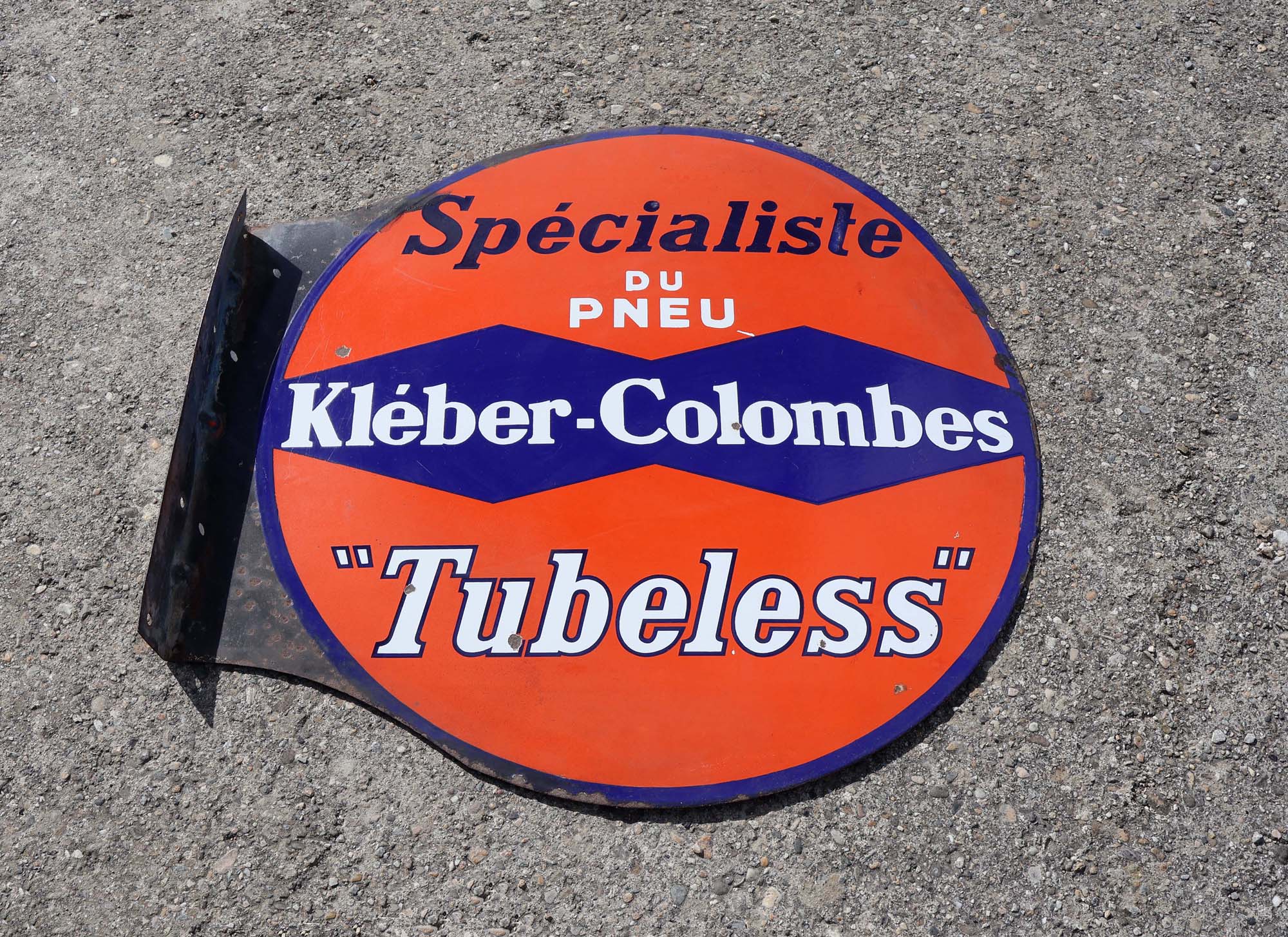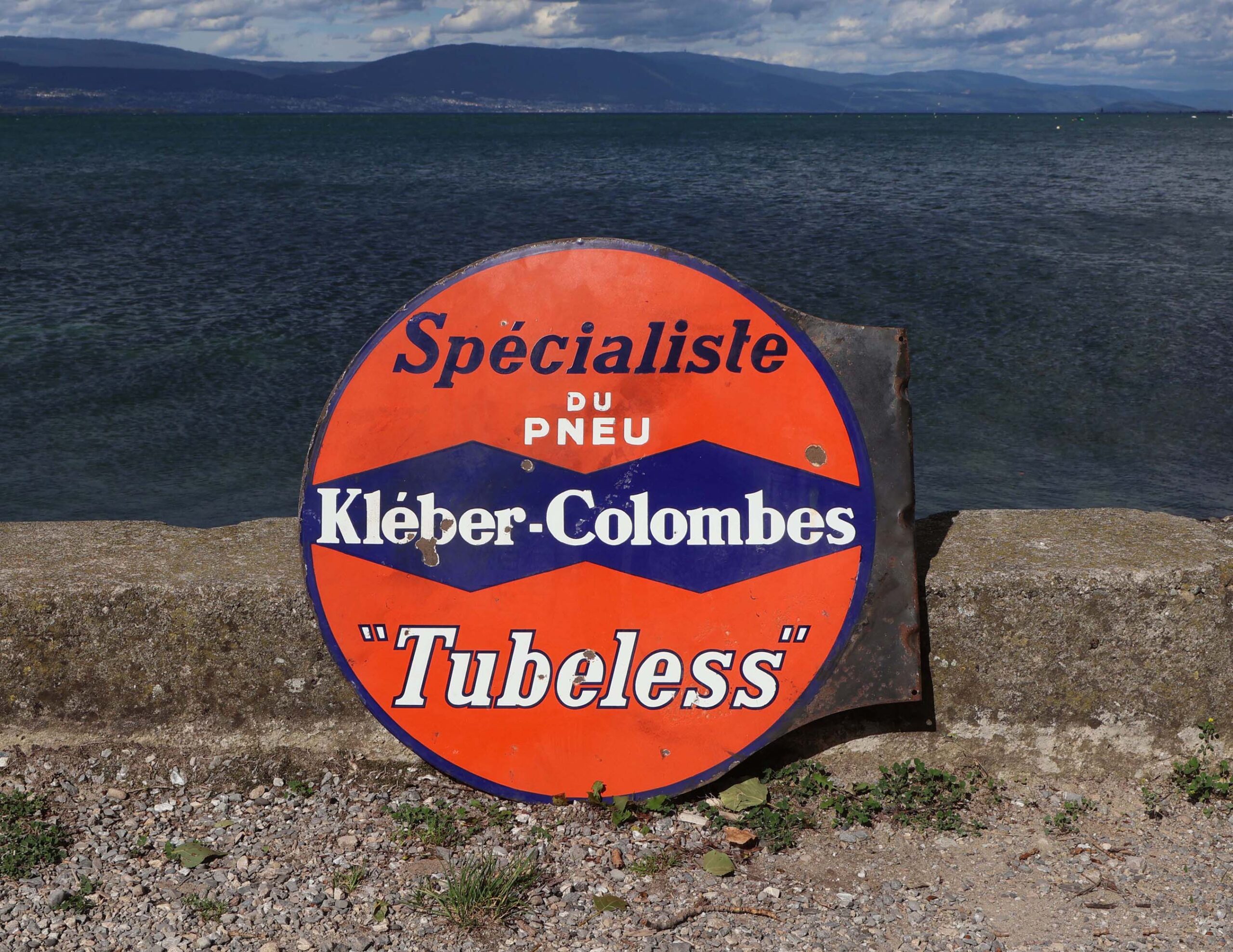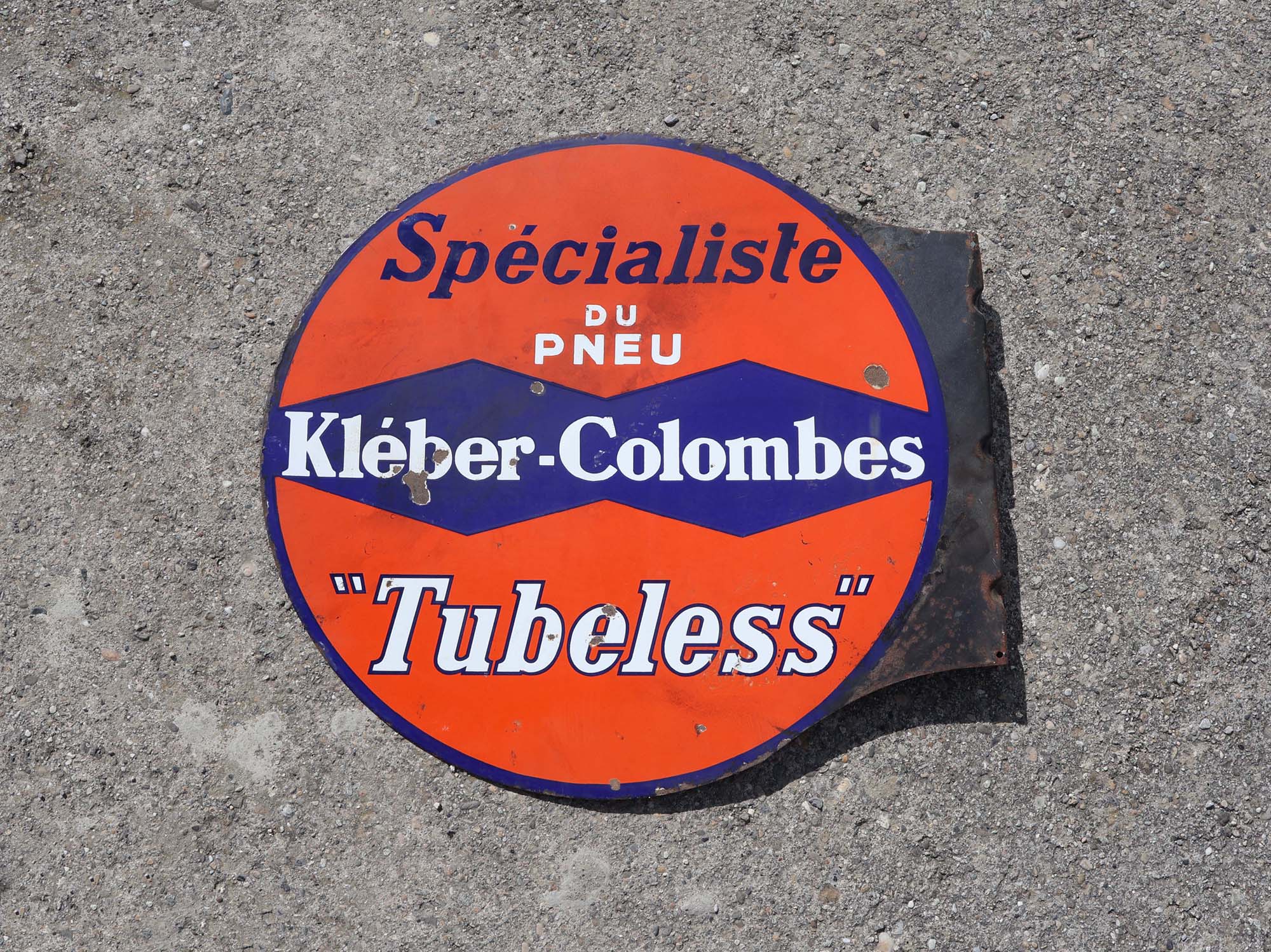 Plaque émaillée Kléber Colombes pneus : C’est une enseigne en potence double face. En tôle émaillée, des années 1950. D’un garage revendeur des pneus Kléber.
