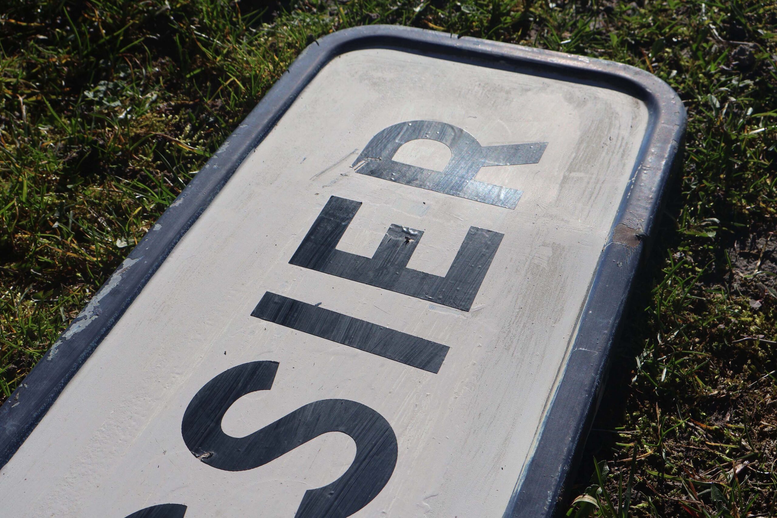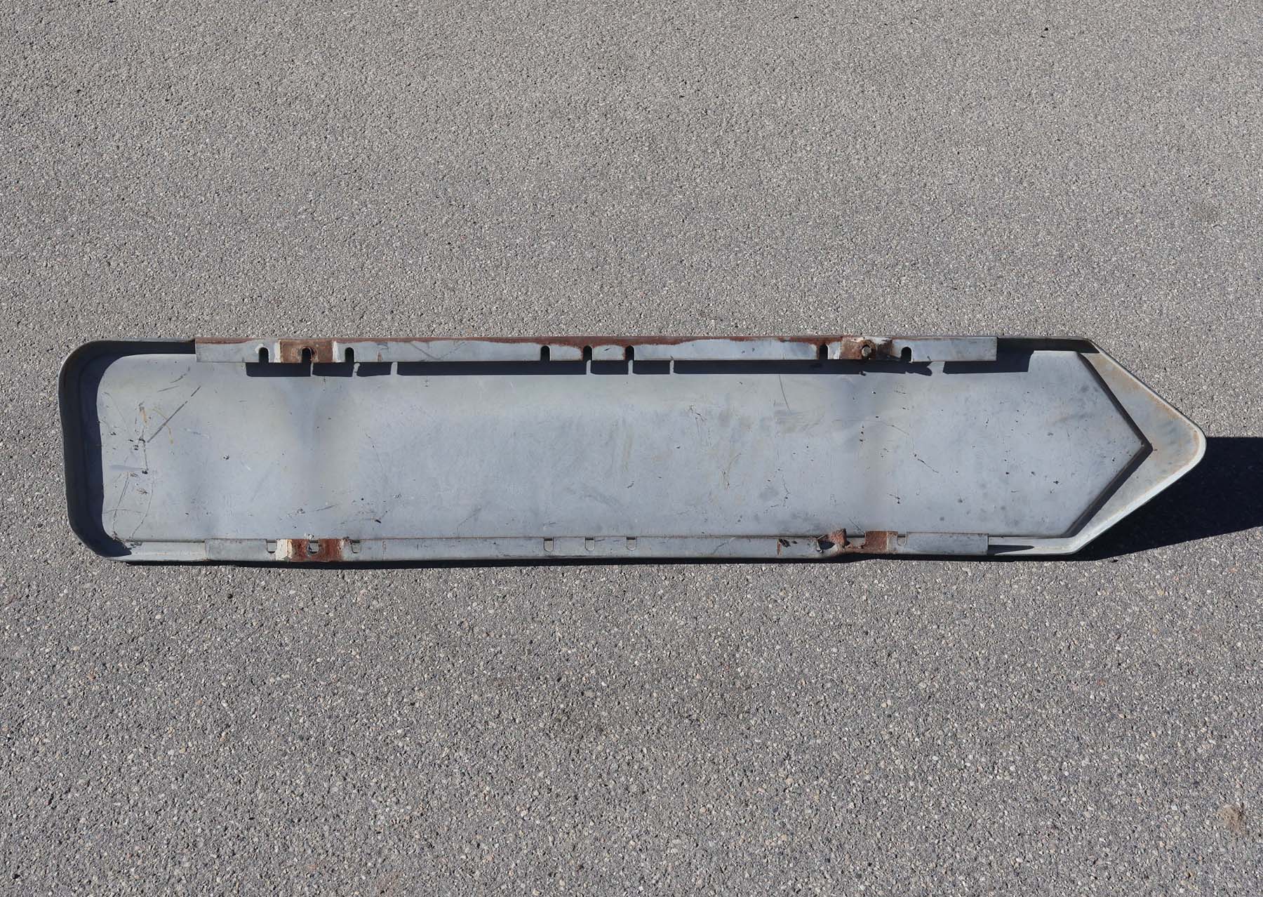 En tôle acier peinte. Format 129 x 25cm, épaisseur 2,5cm, poids 6,7kg. Un peu tordu. On peut l’utiliser pour inscrire autre chose …