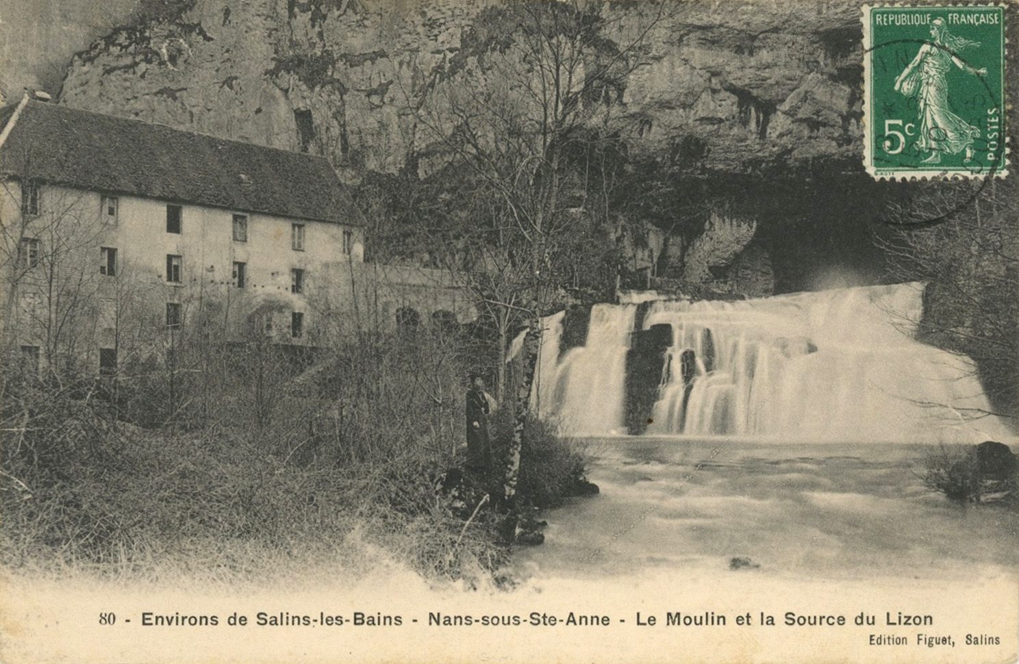 Sur la photo d’illustration des années 1950, On devine une flèche “sources du Lison”, mais avec un S (?).