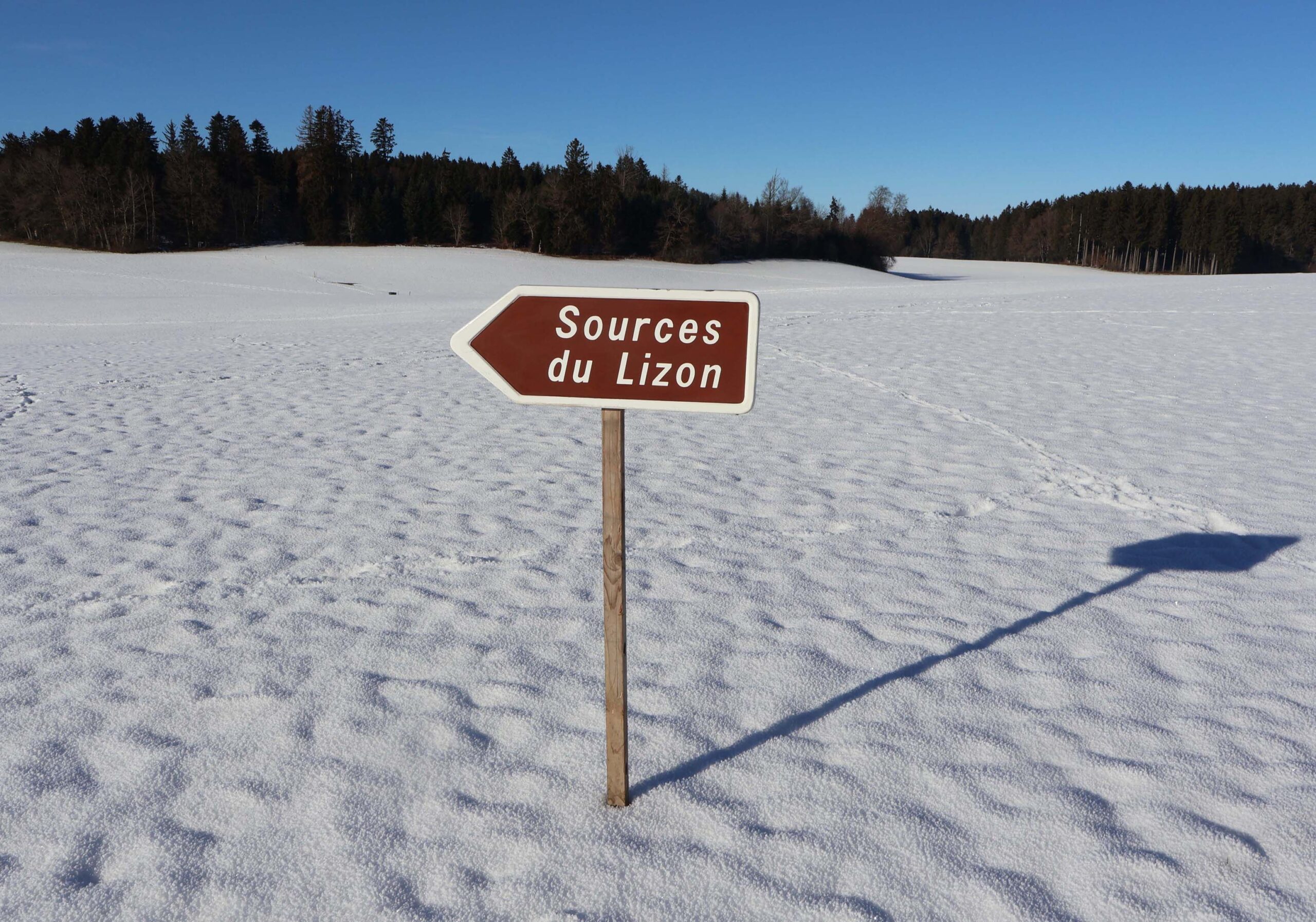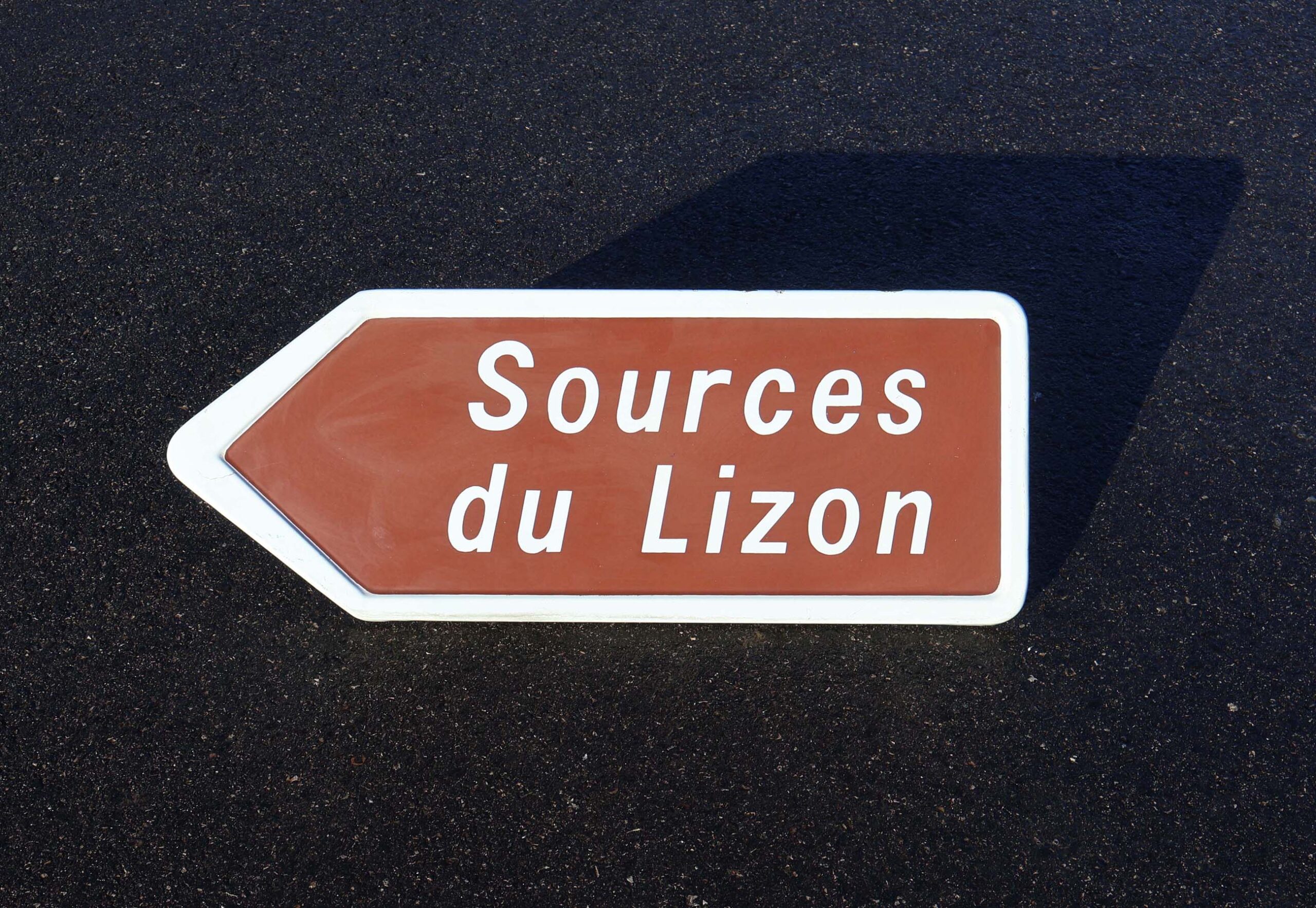 Sources du Lizon panneau émaillé. C’est un écriteau touristique français, flèche de signalisation en tôle émaillée. Pour indiquer la direction des sources du Lizon.