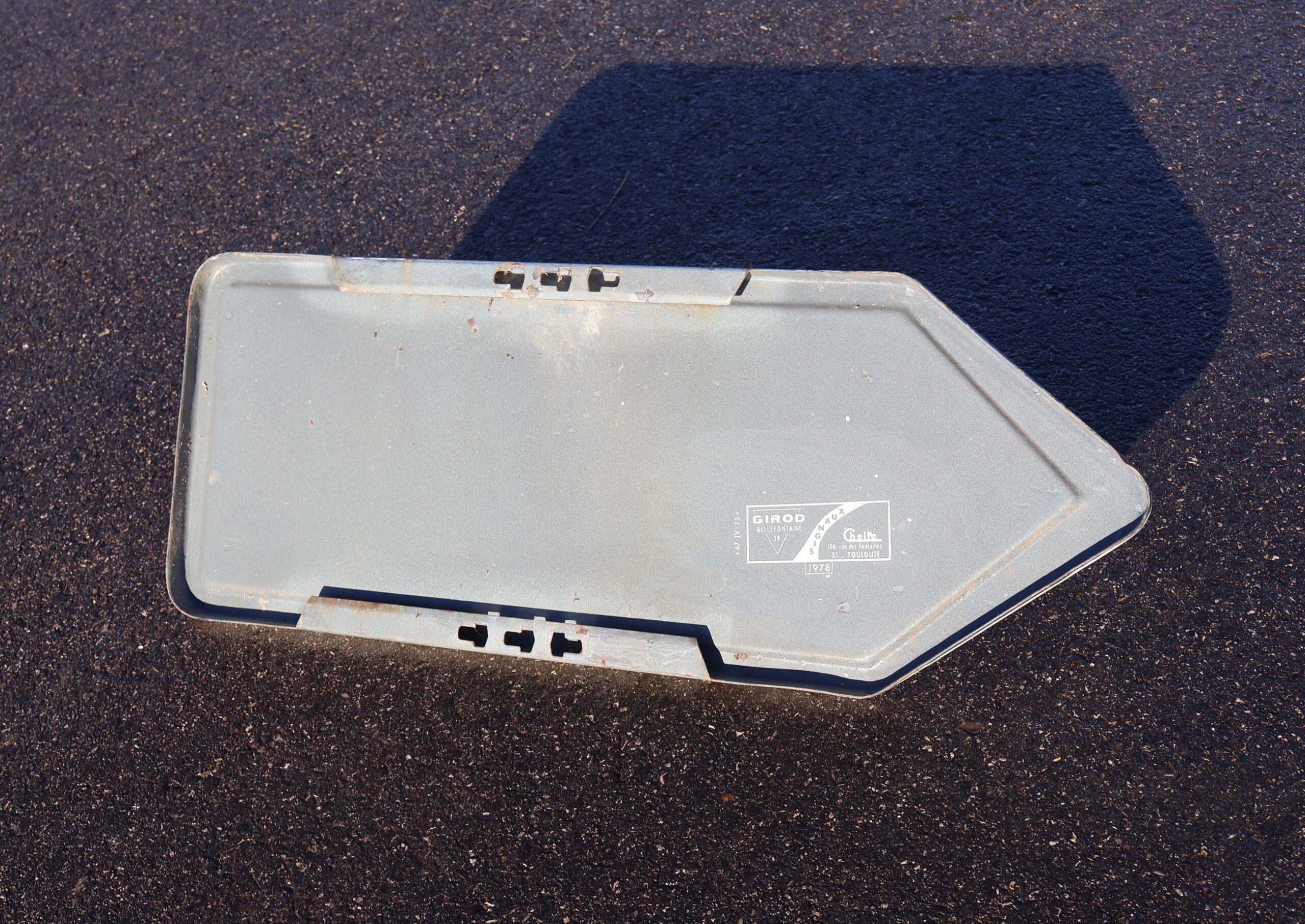 Ce panneau est daté de 1978, fabricant signaux Girod. Avec fond brun et lettrage minuscule en italique, (spécificité pour les panneaux touristiques).